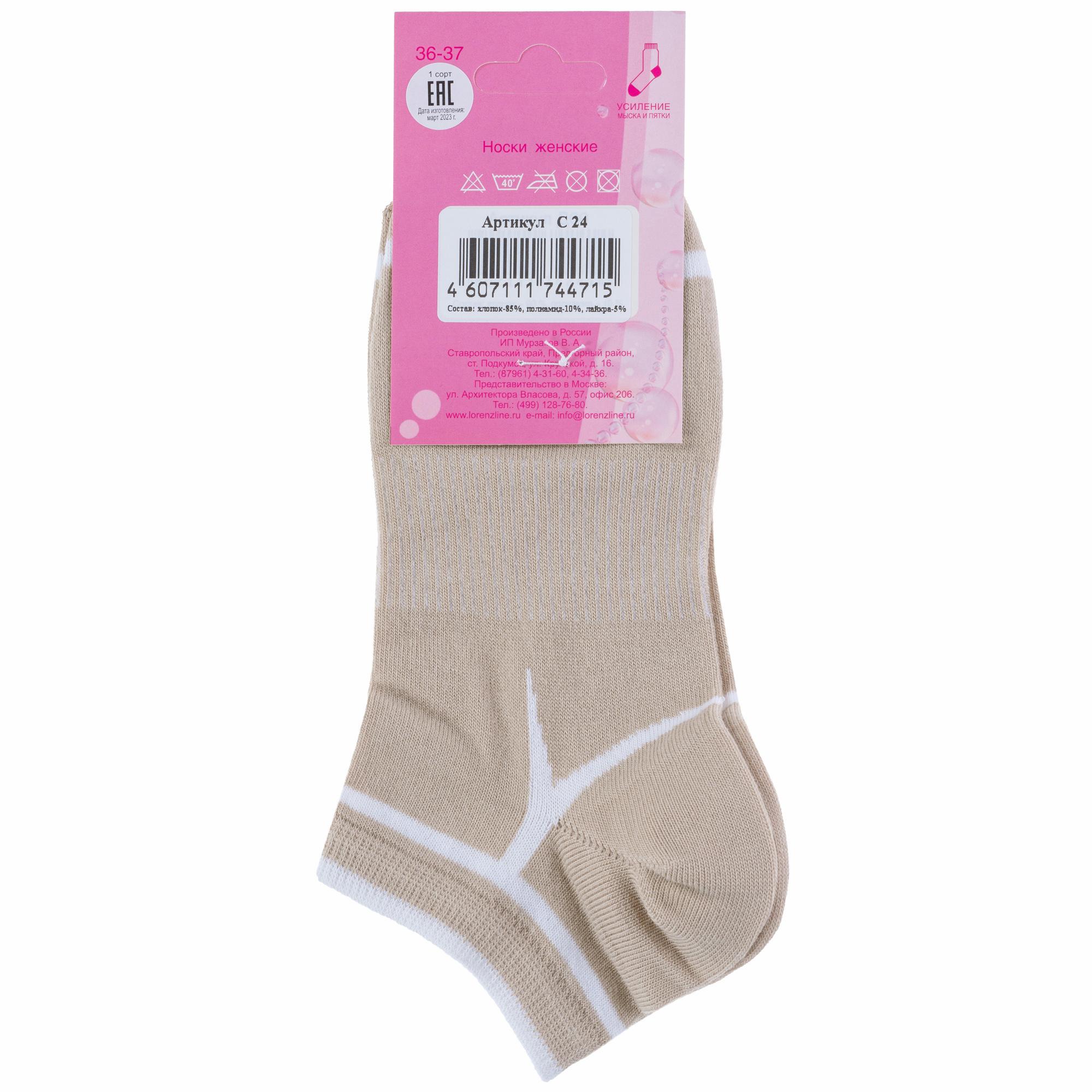 Круглогодичные короткие женские носки, цвет бежевый, спортивные, шов обычный (не бесшовные), принт (рисунок): спортивные, контрастные пятка / мысок / резинка, с узором, состав: 85% хлопок, 10% полиамид, 5% эластан (лайкра), арт. С24. Производитель «ИП Мурзаков В.А., Ставропольский край, Россия» под брендом «Lorenzline».