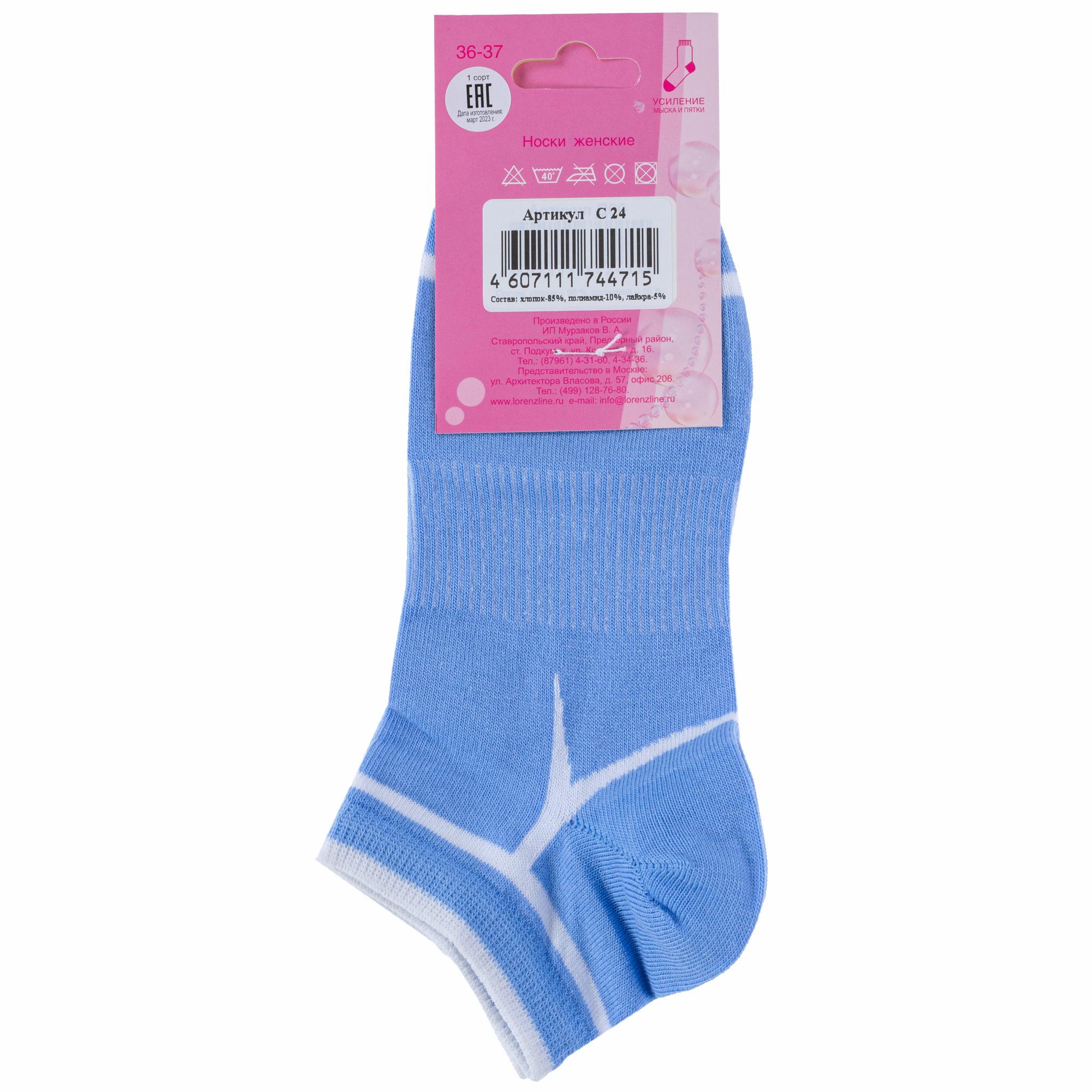 Круглогодичные короткие женские носки, цвет голубой, спортивные, шов обычный (не бесшовные), принт (рисунок): спортивные, контрастные пятка / мысок / резинка, с узором, состав: 85% хлопок, 10% полиамид, 5% эластан (лайкра), арт. С24. Производитель «ИП Мурзаков В.А., Ставропольский край, Россия» под брендом «Lorenzline».