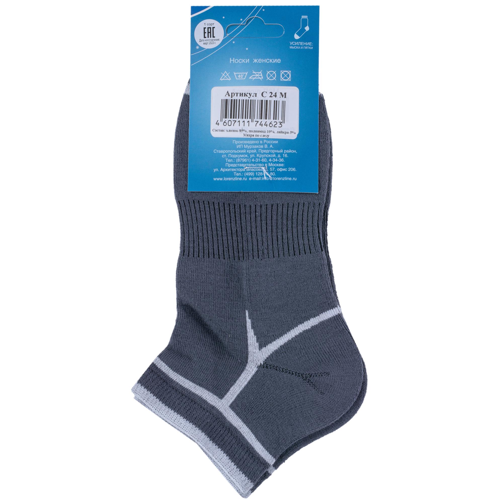 Круглогодичные короткие женские носки, цвет серый, спортивные, с махровым следом, шов кеттельный (бесшовная технология), принт (рисунок): спортивные, контрастные пятка / мысок / резинка, с узором, состав: 85% хлопок, 10% полиамид, 5% эластан (лайкра), арт. С24М. Производитель «ИП Мурзаков В.А., Ставропольский край, Россия» под брендом «Lorenzline».