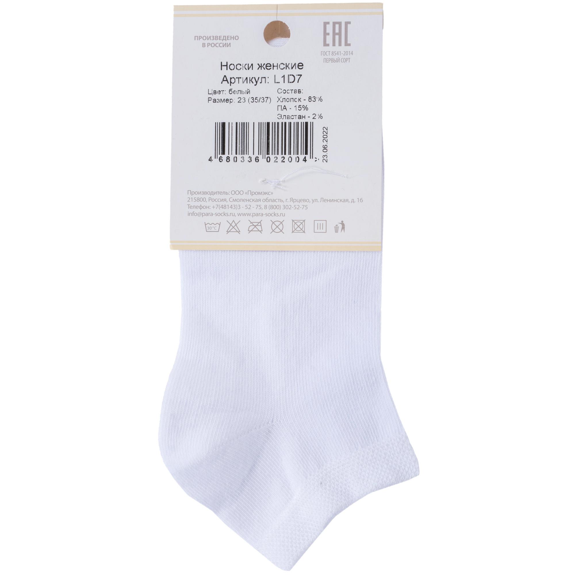 Круглогодичные короткие женские носки, цвет белый, классические, шов обычный (не бесшовные), принт (рисунок): однотонный, без рисунков/узоров, состав: 83% хлопок, 15% полиамид, 2% эластан, арт. L1D7. Производитель «ПРОМЭКС ООО, Смоленская область, Россия» под брендом «Para socks».