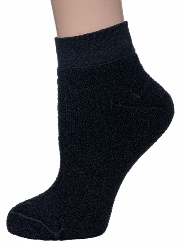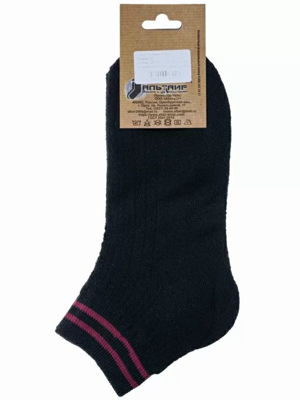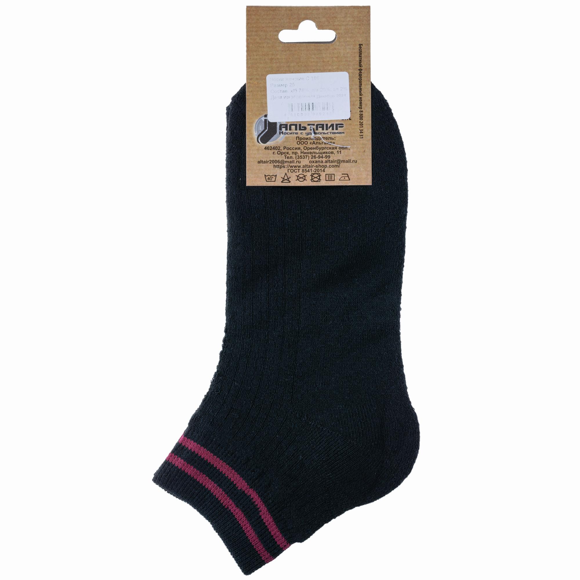 Зимние короткие женские носки, цвет черный, теплые, махровые, классические, шов обычный (не бесшовные), принт (рисунок): полоски, контрастные пятка / мысок / резинка, с узором, состав: 78% хлопок, 20% полиамид, 2% эластан, арт. С186. Производитель «ООО Альтаир, г. Орск, Оренбургская обл, Россия» под брендом «Альтаир».