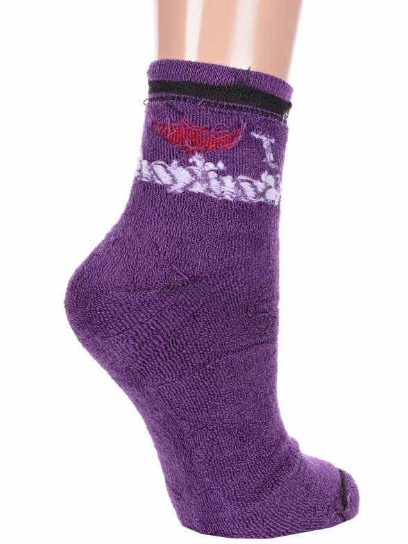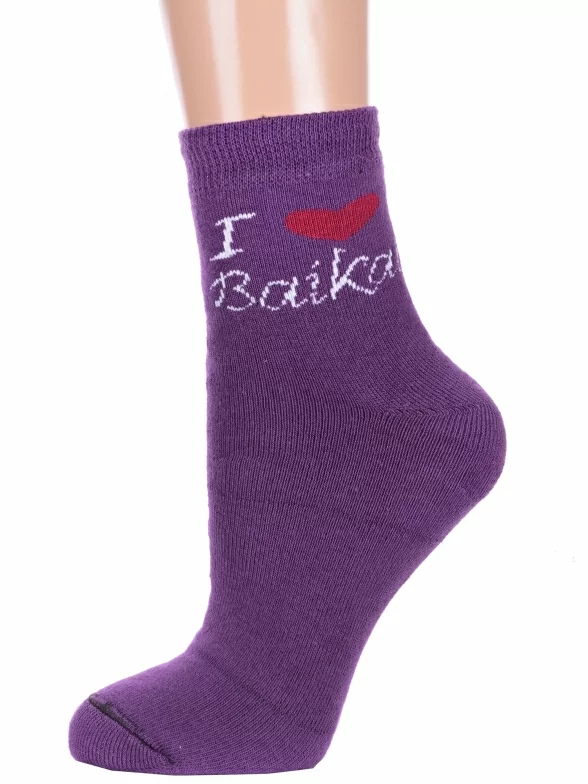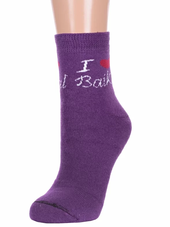 Межсезонные или зимние укороченные женские носки, цвет фиолетовый, теплые, повседневные, махровые, возможно бесшовные, принт (рисунок): сердечки / поцелуи / любовь, надписи, с узором, состав: 80% хлопок, 18% полиамид, 2% эластан, арт. С102. Производитель «ООО Альтаир, г. Орск, Оренбургская обл, Россия» под брендом «Альтаир».