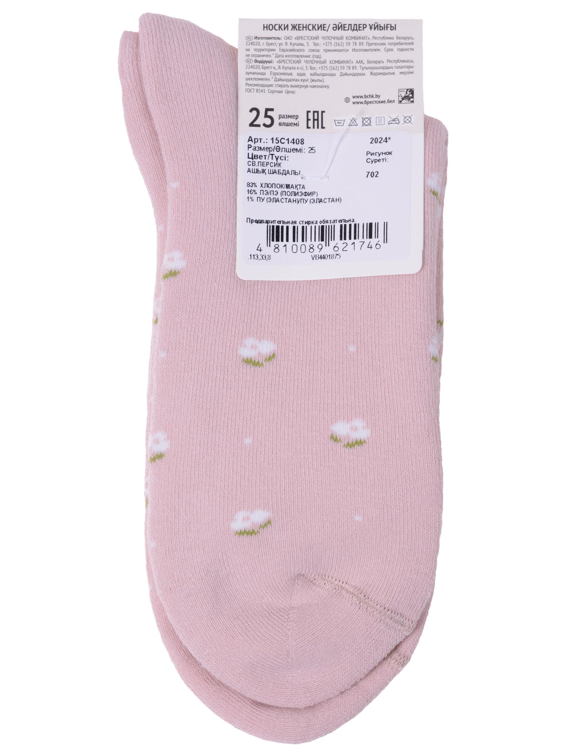 Зимние средней длины женские носки, цвет розовый, махровые, шов кеттельный (бесшовная технология), принт (рисунок): цветы / растения, состав: 83% хлопок, 16% полиэстер, 1% эластан, арт. 15С1408. Производитель «Брестский чулочный комбинат ОАО, Беларусь» под брендом «Брестские (бчк)».