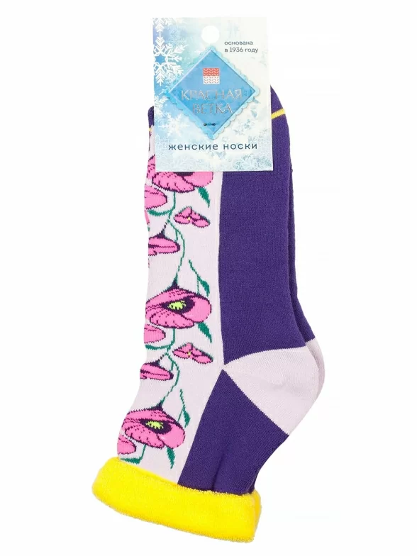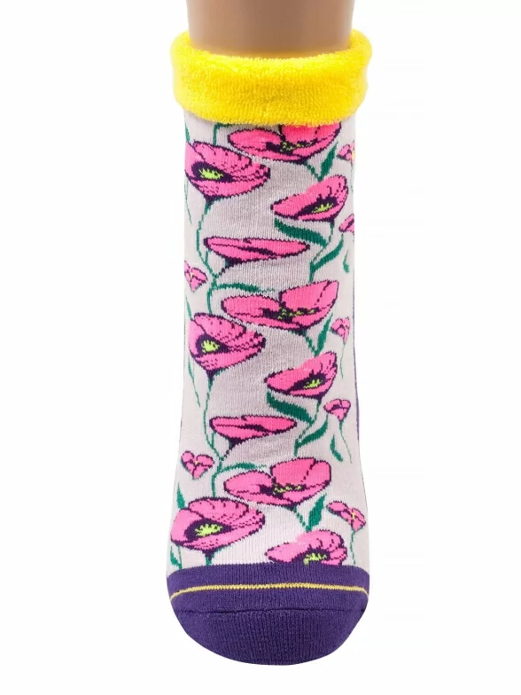 Очень эффектные женские носки, декорированные принтом с тюльпанами и отличающиеся толстой махровой резинкой в тон, которая сама смотрится как цветок. Носки сделаны из плотного приятного махрового трикотажа, а контрастные детали дополняют дизайн модели.