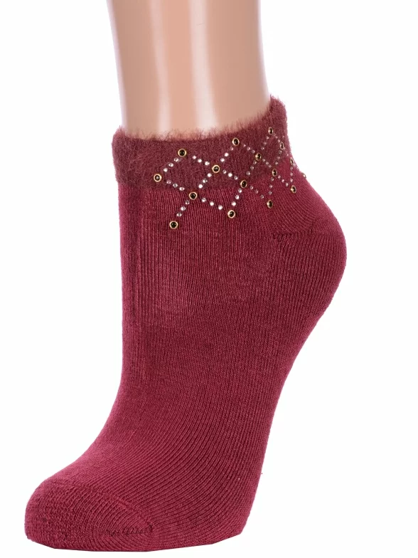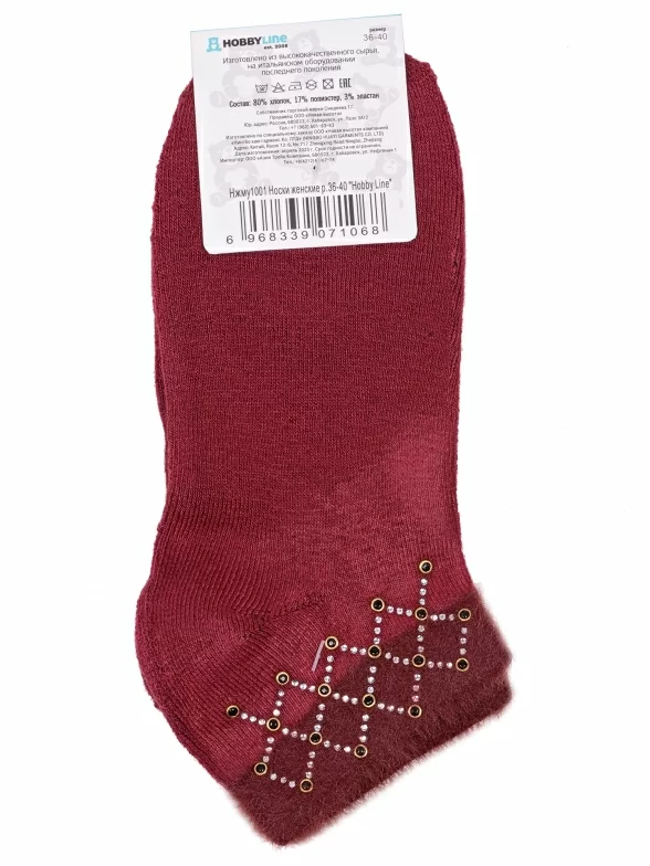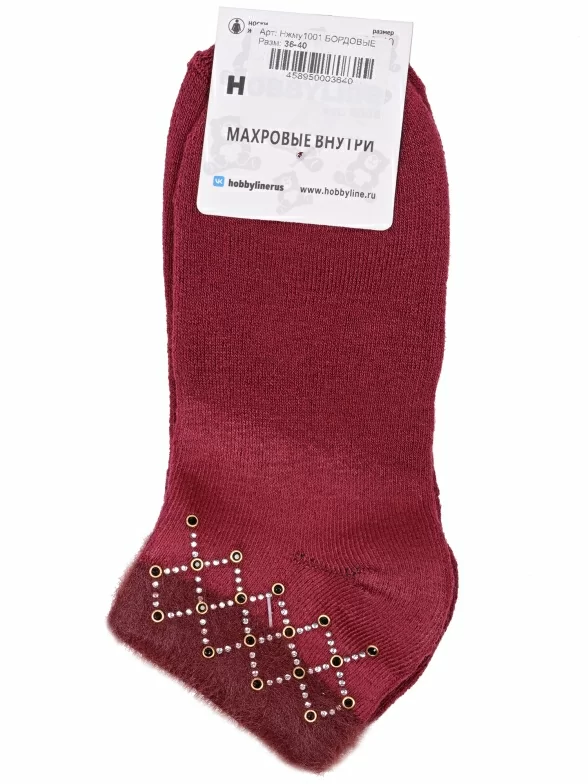 Межсезонные короткие женские носки, цвет бордовый, теплые, с украшениями, необычные, махровые, возможно бесшовные, принт (рисунок): контрастные пятка / мысок / резинка, геометрия, с узором, состав: 80% хлопок, 17% полиэстер, 3% эластан, арт. Нжму1001. Производитель «Китай, страна бренда - Россия» под брендом «Hobby line».