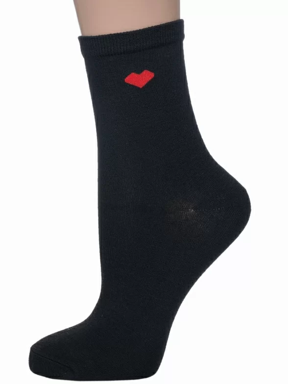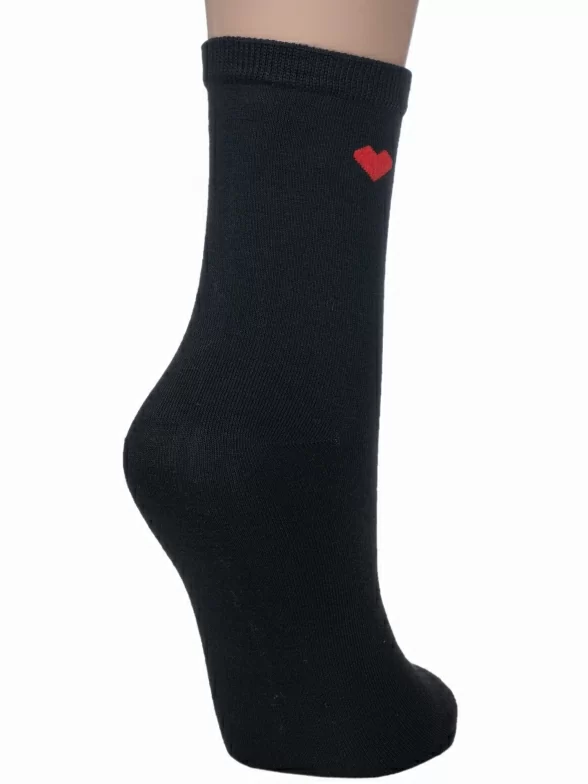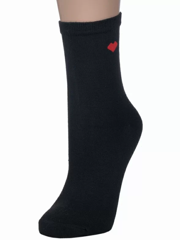 Круглогодичные укороченные женские носки, цвет черный, классические, шов обычный (не бесшовные), принт (рисунок): сердечки / поцелуи / любовь, однотонный, небольшой рисунок, состав: 75% хлопок, 23% полиамид, 2% эластан, арт. 412-06. Производитель «Китай, страна бренда - Россия» под брендом «Hobby line».