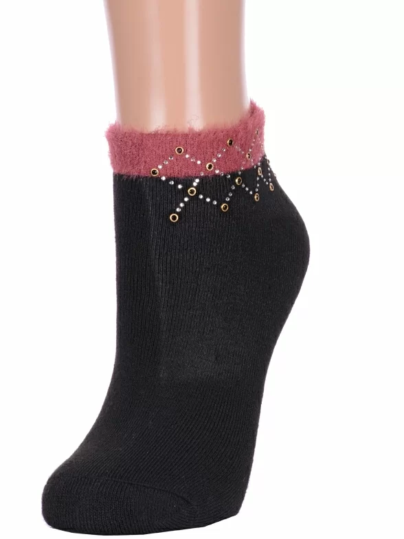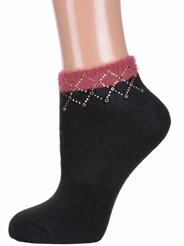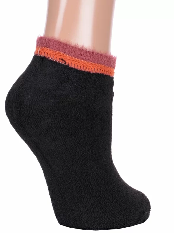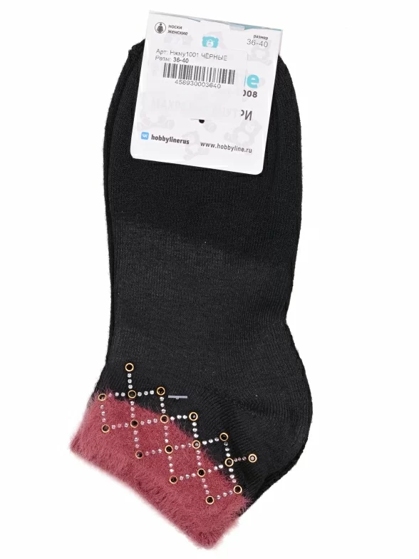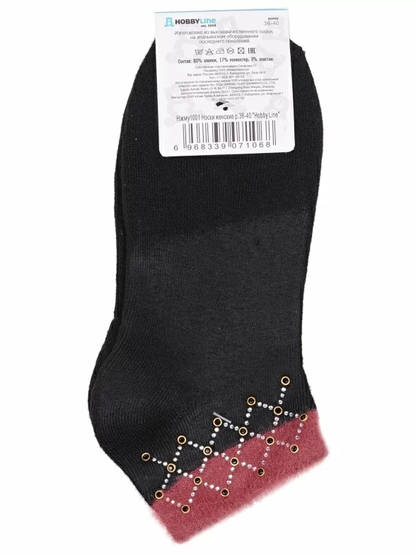 Межсезонные короткие женские носки, цвет черный, теплые, с украшениями, необычные, махровые, возможно бесшовные, принт (рисунок): контрастные пятка / мысок / резинка, геометрия, с узором, состав: 80% хлопок, 17% полиэстер, 3% эластан, арт. Нжму1001. Производитель «Китай, страна бренда - Россия» под брендом «Hobby line».