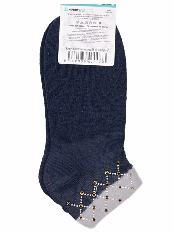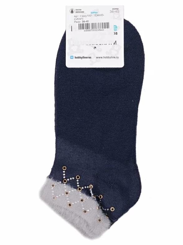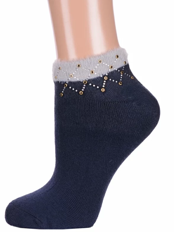 Межсезонные короткие женские носки, цвет темно-синий, теплые, с украшениями, необычные, махровые, возможно бесшовные, принт (рисунок): контрастные пятка / мысок / резинка, геометрия, с узором, состав: 80% хлопок, 17% полиэстер, 3% эластан, арт. Нжму1001. Производитель «Китай, страна бренда - Россия» под брендом «Hobby line».