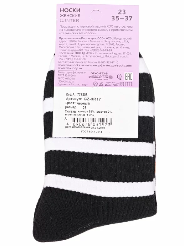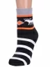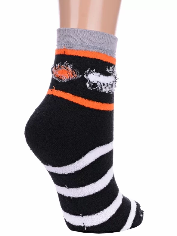 Межсезонные или зимние укороченные женские носки, цвет черный, теплые, повседневные, махровые, шов плоский, принт (рисунок): полоски, новый год, контрастные пятка / мысок / резинка, животные, с узором, состав: 88% хлопок, 10% полиамид, 2% эластан, арт. GZ-3R17. Производитель «ХОХ» Россия под брендом «Хох».