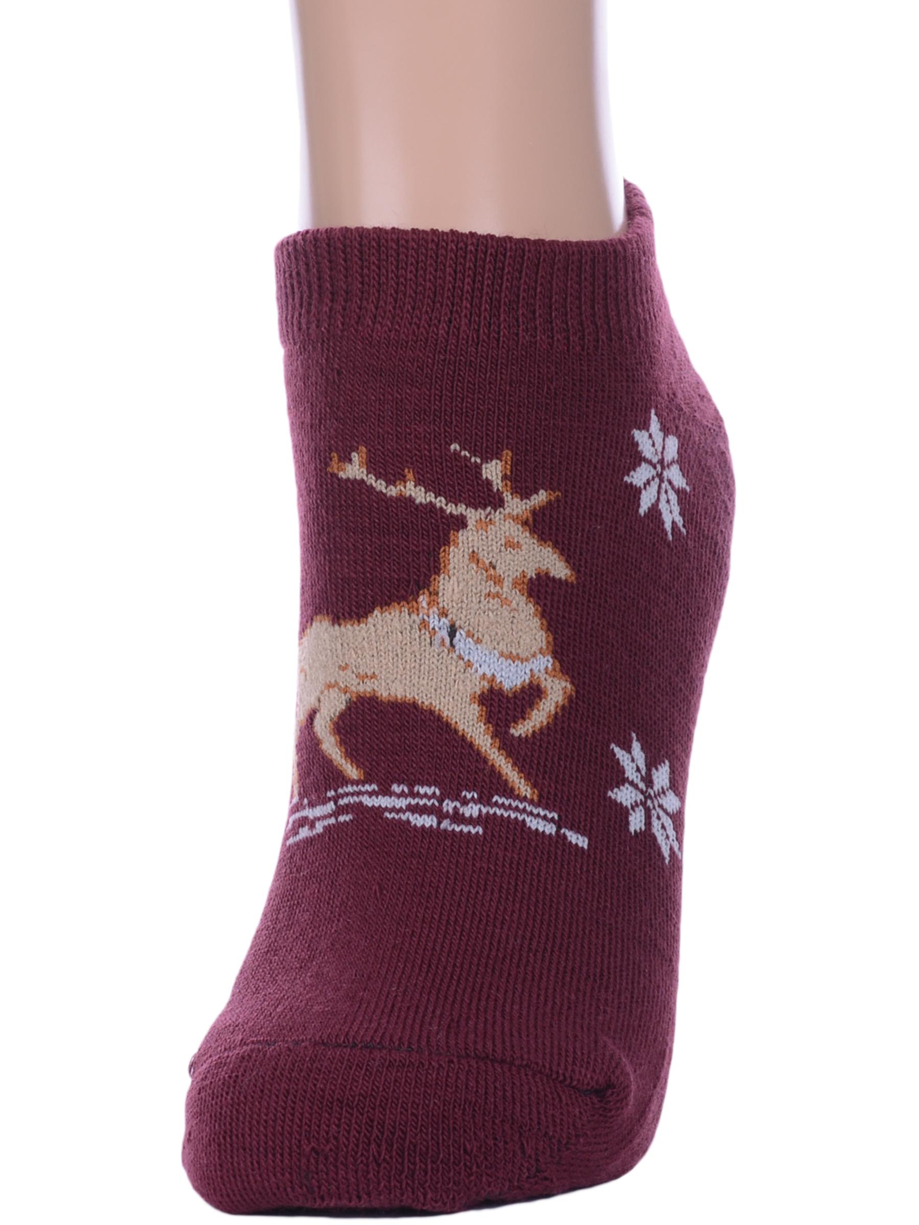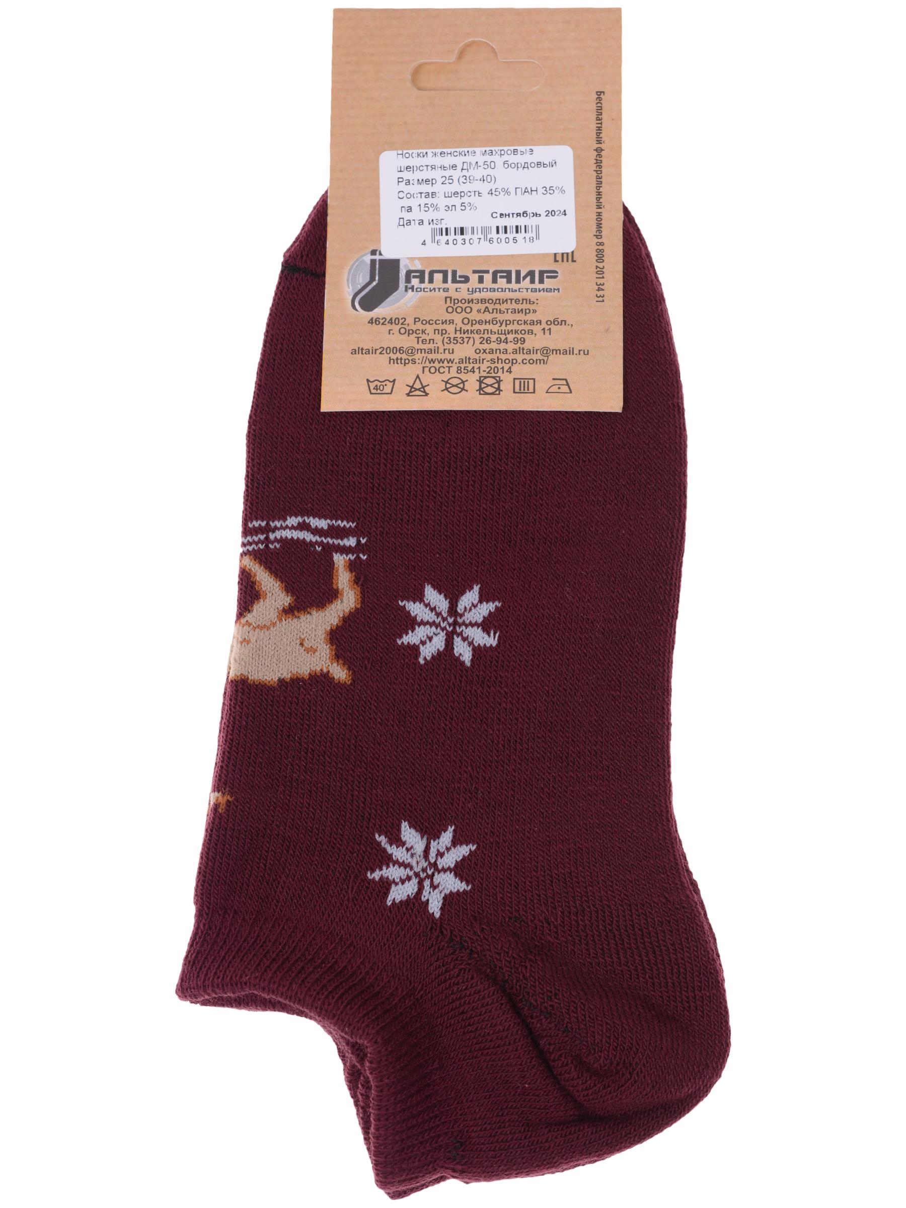 Зимние короткие женские носки, цвет бордовый, теплые, махровые, шов обычный (не бесшовные), принт (рисунок): зимний, животные, состав: 45% шерсть, 35% ПАН, 15% полиамид, 5% эластан, арт. ДМ-50. Производитель «ООО Альтаир, г. Орск, Оренбургская обл, Россия» под брендом «Альтаир».