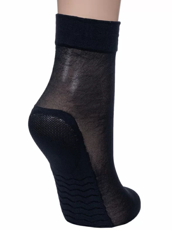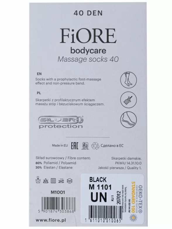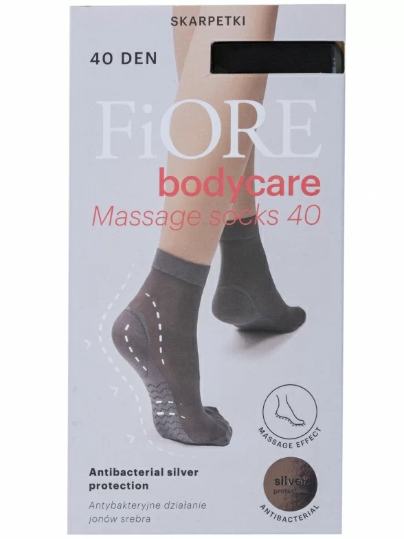 Укороченная модель плотностью 40 den с ослабленной резинкой и эффектом массажа снизу стопы за счет особой уплотненной вязки. Применение специальной технологии Silver Fresh препятствует размножению микробов и развитию грибковых заболеваний, а также предотвращает появление неприятного запаха. Связаны в Польше из 80% полиамида с добавлением 20% эластана, благодаря чему носки достаточно износостойки и хорошо тянутся.