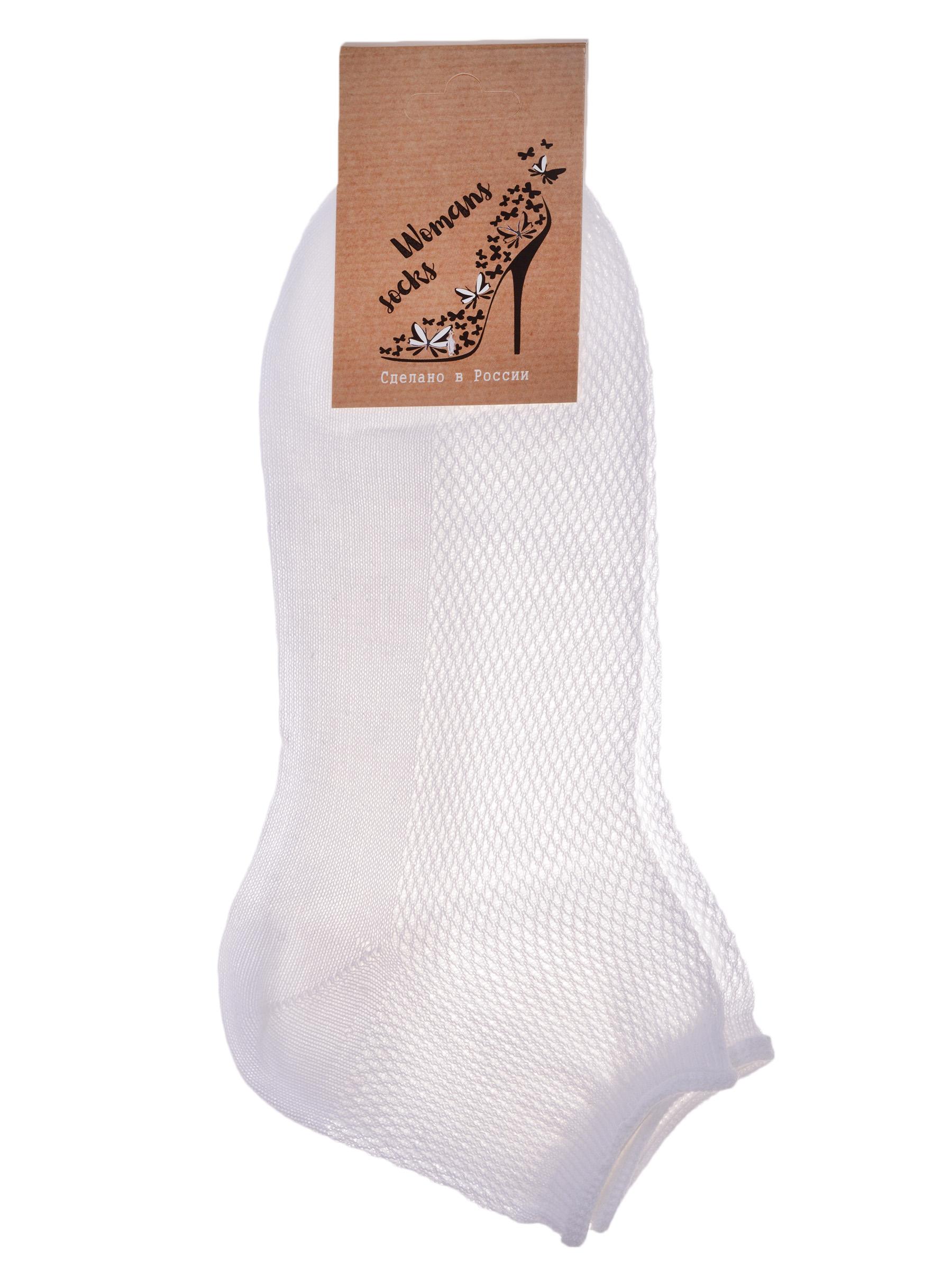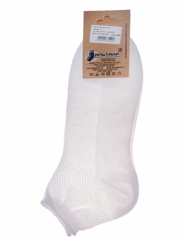 Летние укороченные женские носки, цвет белый, в сеточку, шов обычный (не бесшовные), принт (рисунок): без рисунков/узоров, состав: 75% хлопок, 25% полиамид, арт. А33. Производитель «ООО Альтаир, г. Орск, Оренбургская обл, Россия» под брендом «Альтаир».