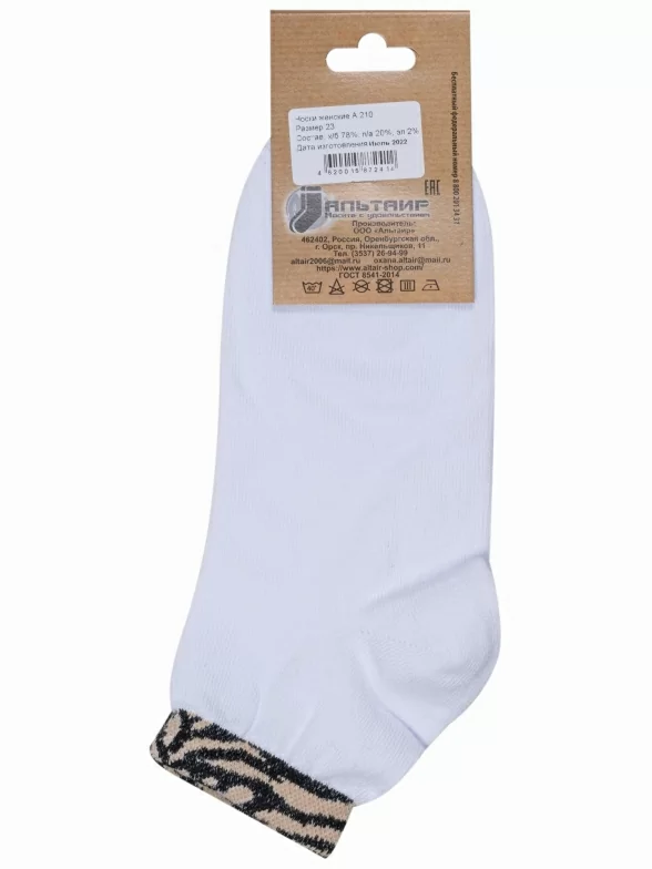 Круглогодичные укороченные женские носки, цвет белый, повседневные, шов обычный (не бесшовные), принт (рисунок): контрастные пятка / мысок / резинка, однотонный, состав: 78% хлопок, 20% полиамид, 2% эластан, арт. А210. Производитель «ООО Альтаир, г. Орск, Оренбургская обл, Россия» под брендом «Альтаир».