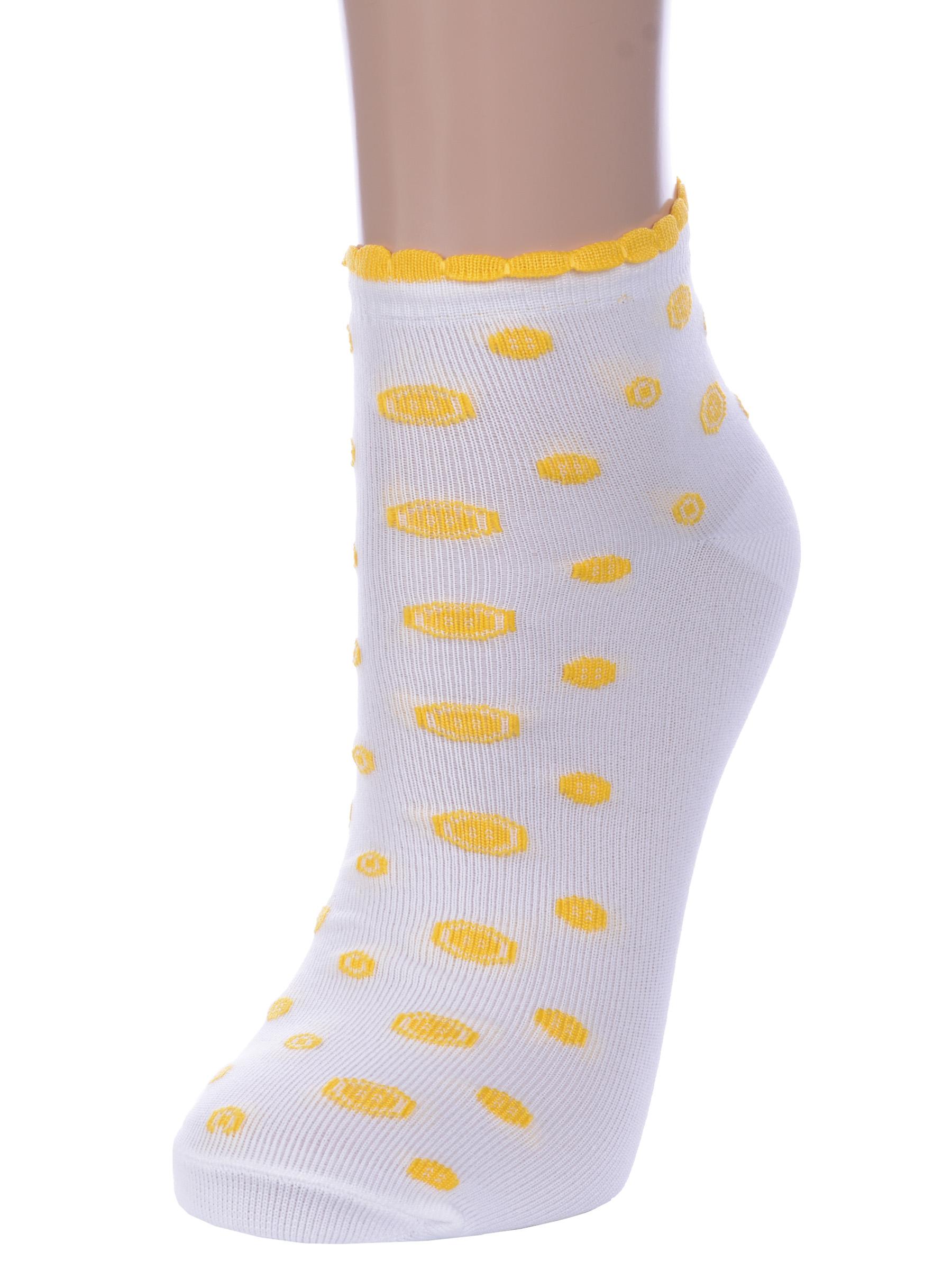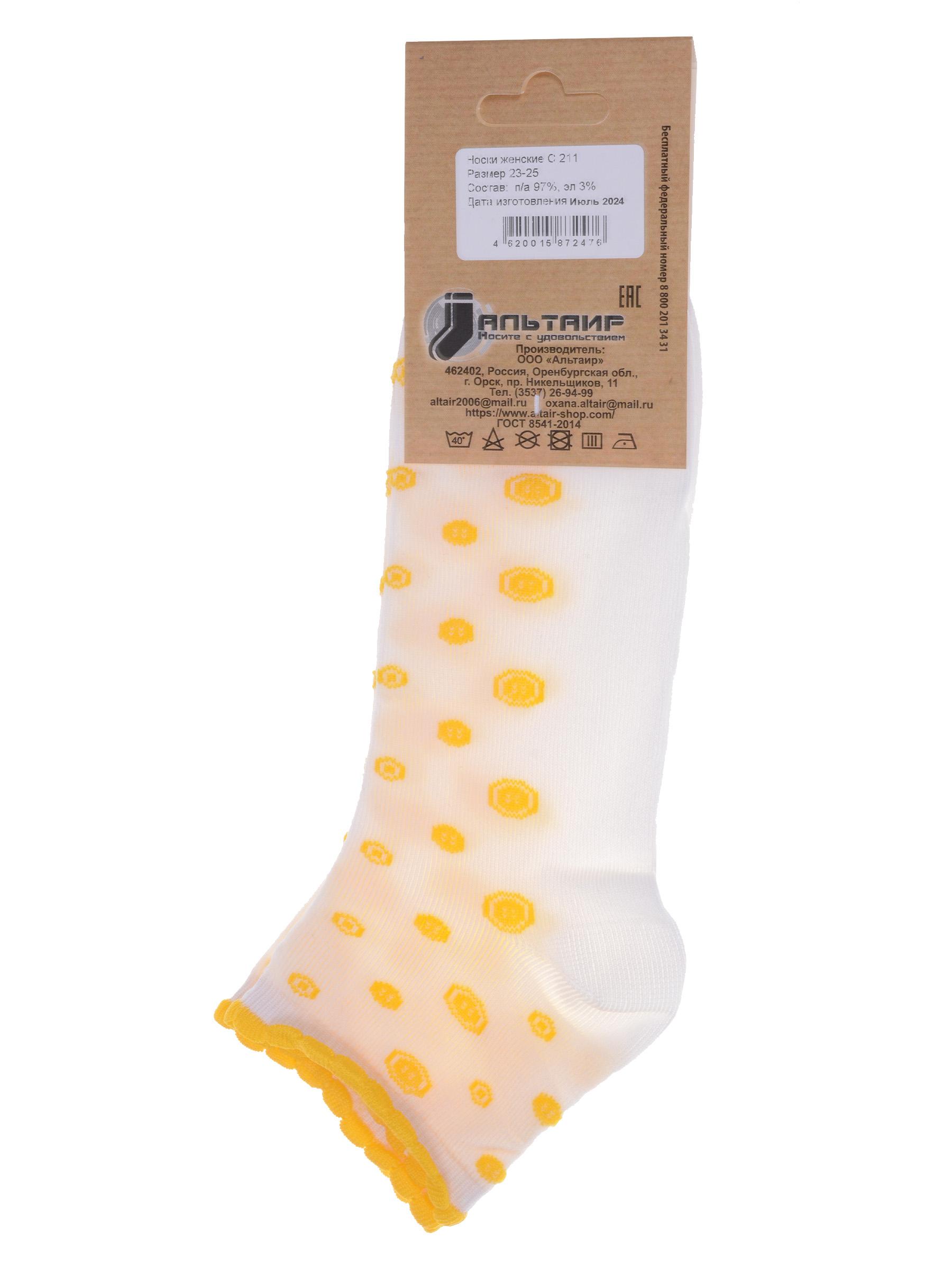 Межсезонные короткие женские носки, цвет желтый-белый, повседневные, возможно бесшовные, принт (рисунок): контрастные пятка / мысок / резинка, горох / точка, с узором, состав: 97% полиамид, 3% эластан, арт. С211. Производитель «ООО Альтаир, г. Орск, Оренбургская обл, Россия» под брендом «Альтаир».