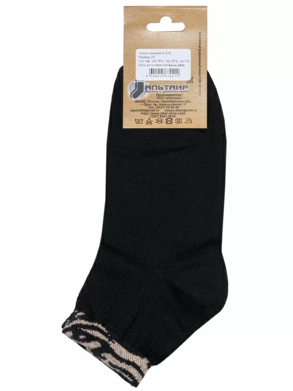 Круглогодичные укороченные женские носки, цвет черный, повседневные, шов обычный (не бесшовные), принт (рисунок): контрастные пятка / мысок / резинка, однотонный, состав: 78% хлопок, 20% полиамид, 2% эластан, арт. А210. Производитель «ООО Альтаир, г. Орск, Оренбургская обл, Россия» под брендом «Альтаир».