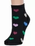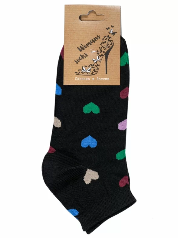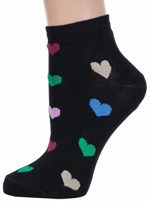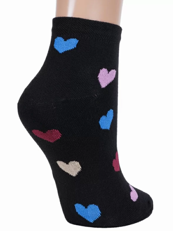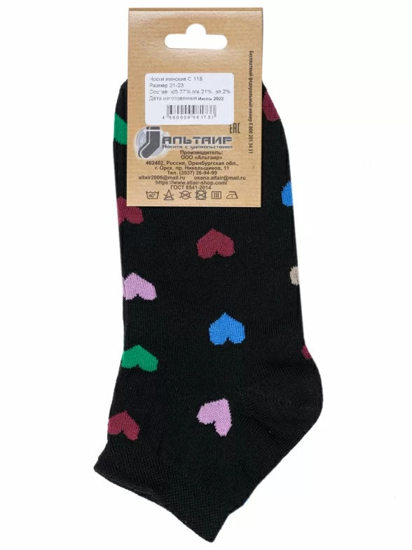 Круглогодичные укороченные женские носки, цвет черный, повседневные, шов обычный (не бесшовные), принт (рисунок): сердечки / поцелуи / любовь, с узором, состав: 78% хлопок, 20% полиамид, 2% эластан, арт. С118. Производитель «ООО Альтаир, г. Орск, Оренбургская обл, Россия» под брендом «Альтаир».