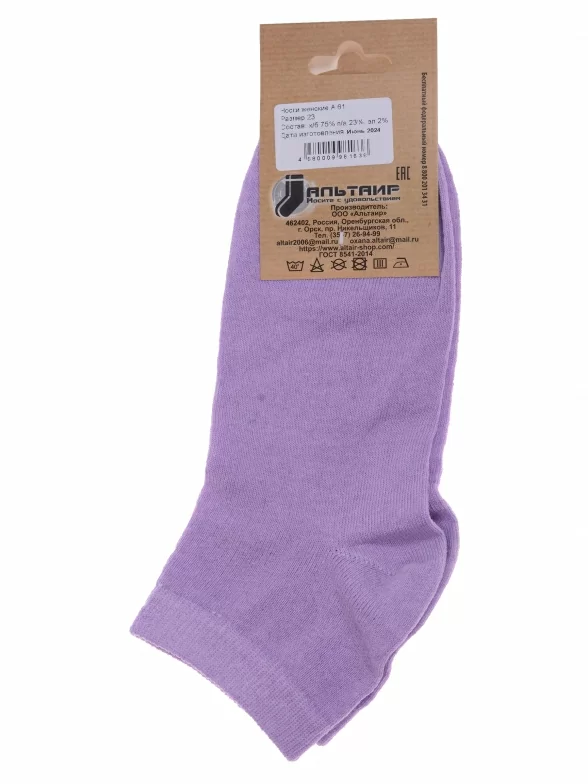 Летние короткие женские носки, цвет сиреневый, классические, шов обычный (не бесшовные), принт (рисунок): без рисунков/узоров, состав: 75% хлопок, 23% полиамид, 2% эластан, арт. А61. Производитель «ООО Альтаир, г. Орск, Оренбургская обл, Россия» под брендом «Альтаир».