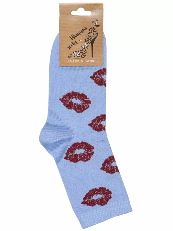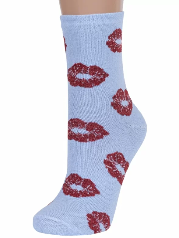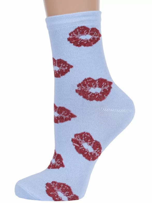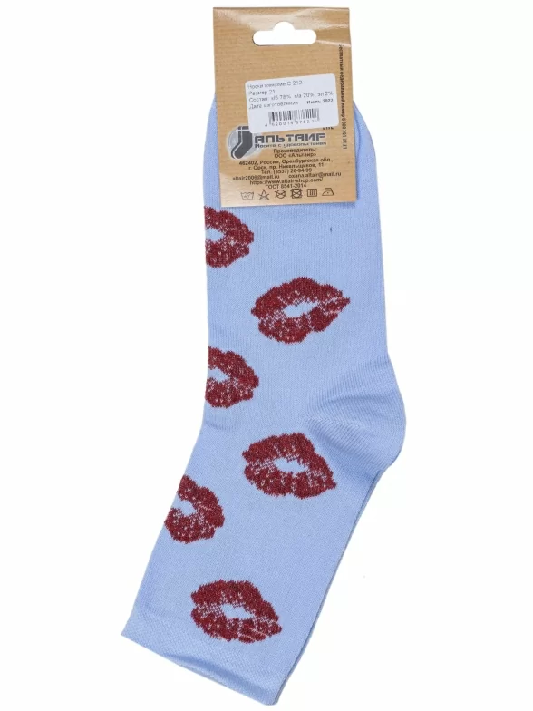 Круглогодичные укороченные женские носки, цвет голубой, повседневные, шов обычный (не бесшовные), принт (рисунок): сердечки / поцелуи / любовь, с узором, состав: 80% хлопок, 18% полиамид, 2% эластан, арт. С212. Производитель «ООО Альтаир, г. Орск, Оренбургская обл, Россия» под брендом «Альтаир».