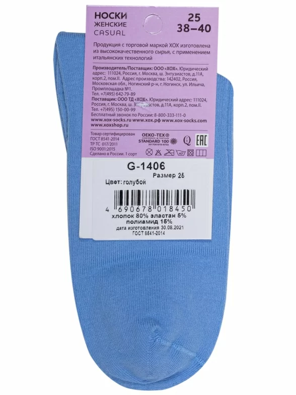 Женские носки без резинки ХОХ, G-1406, ГОЛУБЫЕ