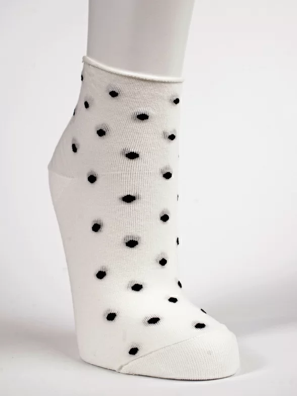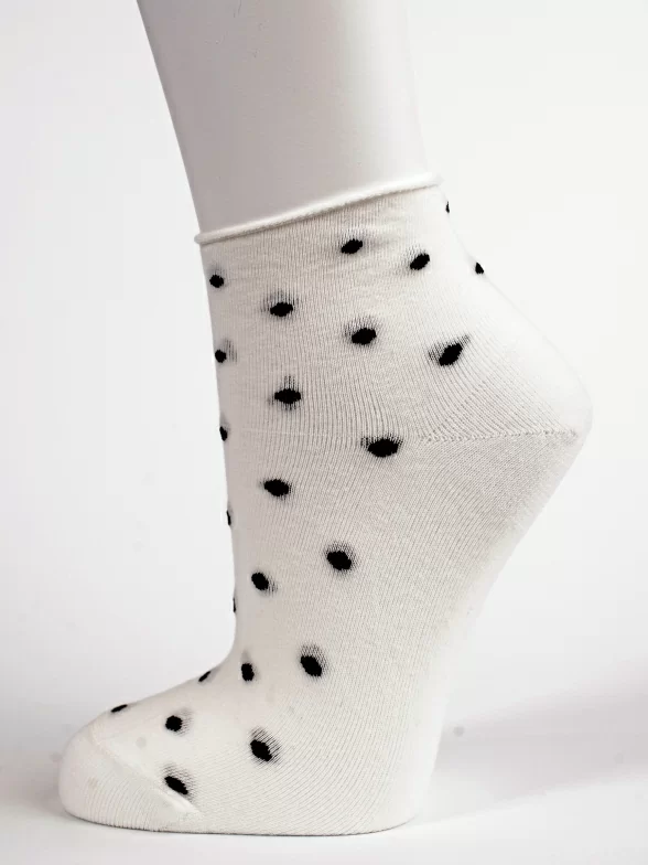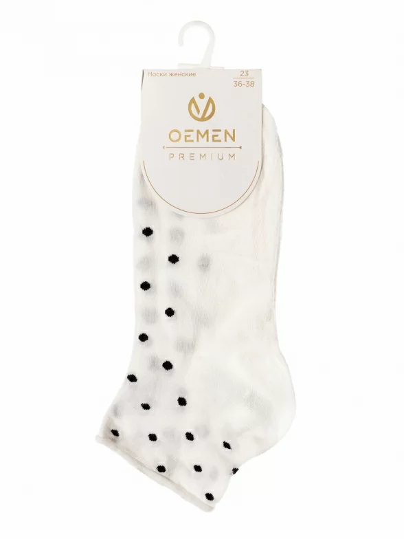 Круглогодичные короткие женские носки, цвет белый, медицинские, без резинки, шов обычный (не бесшовные), принт (рисунок): горох / точка, состав: 97% хлопок, 2% полиамид, 1% лайкра, арт. PW826. Производитель «Oemen» Китай под брендом «Oemen».