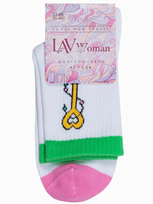 Круглогодичные укороченные женские носки, цвет белый, повседневные, шов обычный (не бесшовные), принт (рисунок): сердечки / поцелуи / любовь, в рубчик, с узором, состав: 72% хлопок, 25% полиэстер, 3% эластан, арт. 6С1003. Производитель «АО Борисоглебский трикотаж, Воронежская обл, Россия» под брендом «Борисоглебский трикотаж».