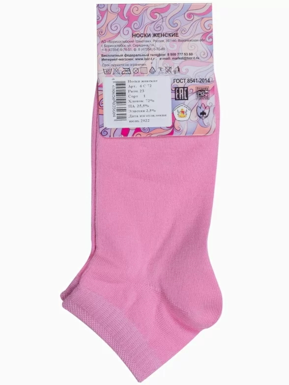 Круглогодичные короткие женские носки, цвет розовый, классические, шов обычный (не бесшовные), принт (рисунок): однотонный, без рисунков/узоров, состав: 72% хлопок, 25.5% полиамид, 2.5% эластан, арт. 6С72. Производитель «АО Борисоглебский трикотаж, Воронежская обл, Россия» под брендом «Борисоглебский трикотаж».