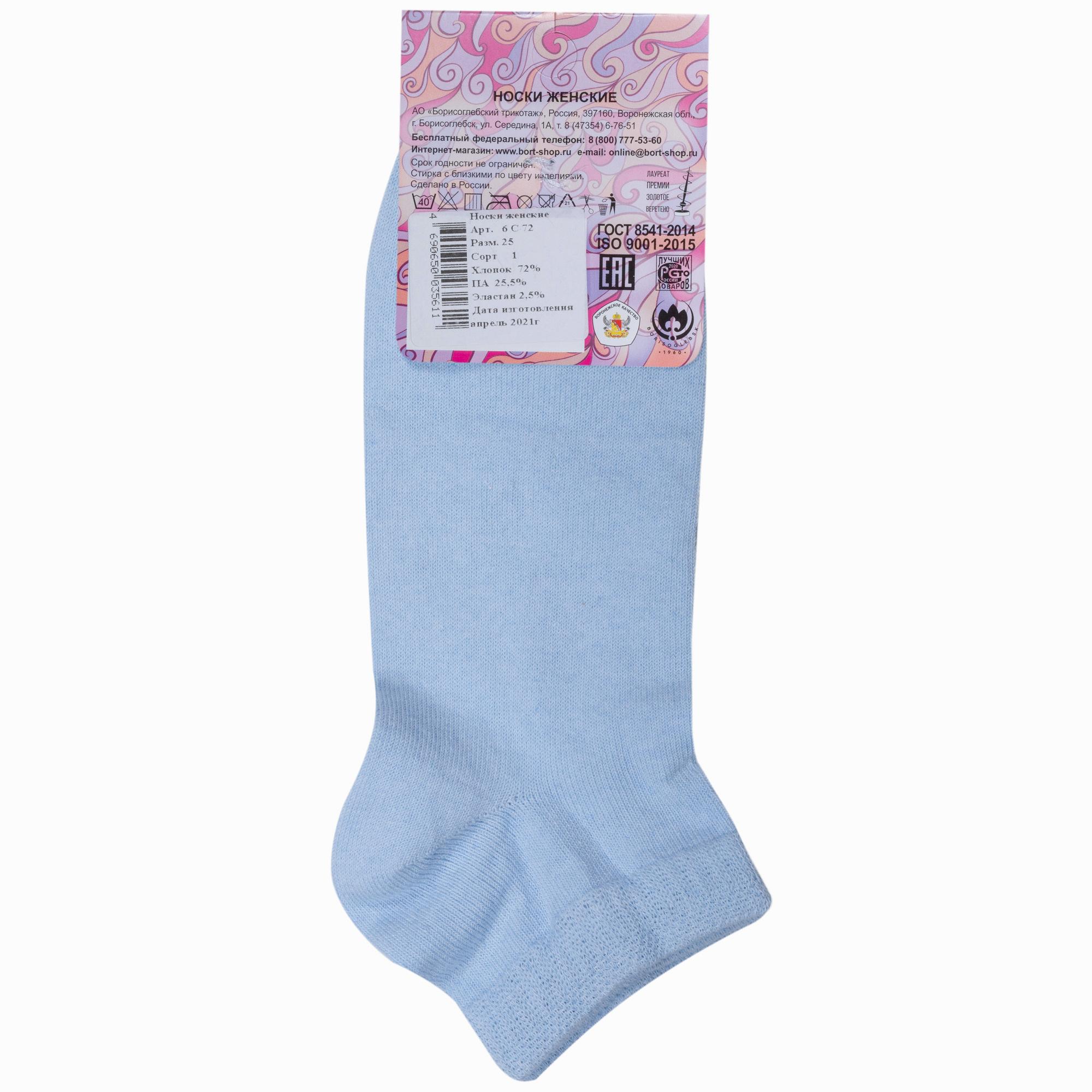 Круглогодичные короткие женские носки, цвет голубой, классические, шов обычный (не бесшовные), принт (рисунок): однотонный, без рисунков/узоров, состав: 72% хлопок, 25.5% полиамид, 2.5% эластан, арт. 6С72. Производитель «АО Борисоглебский трикотаж, Воронежская обл, Россия» под брендом «Борисоглебский трикотаж».