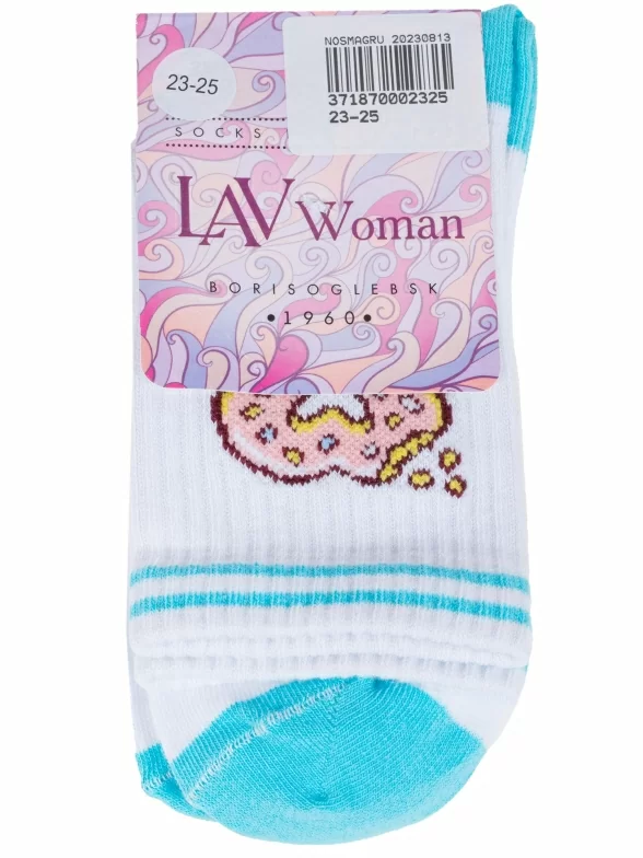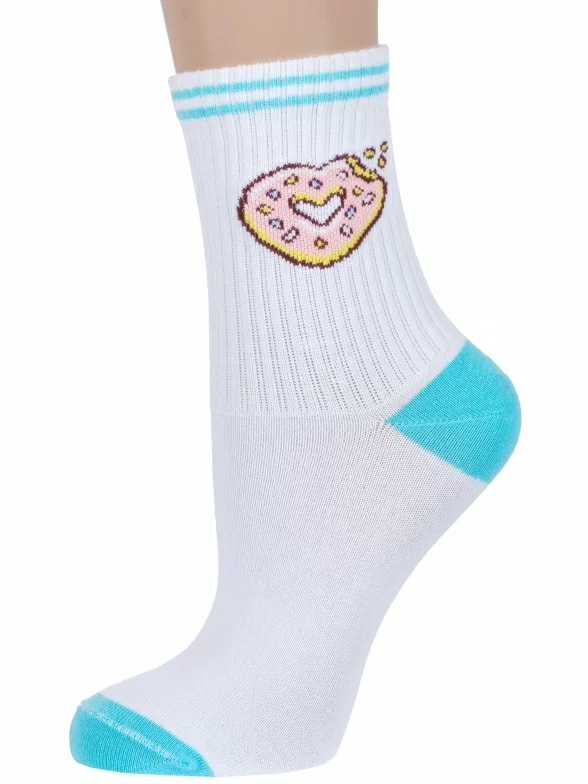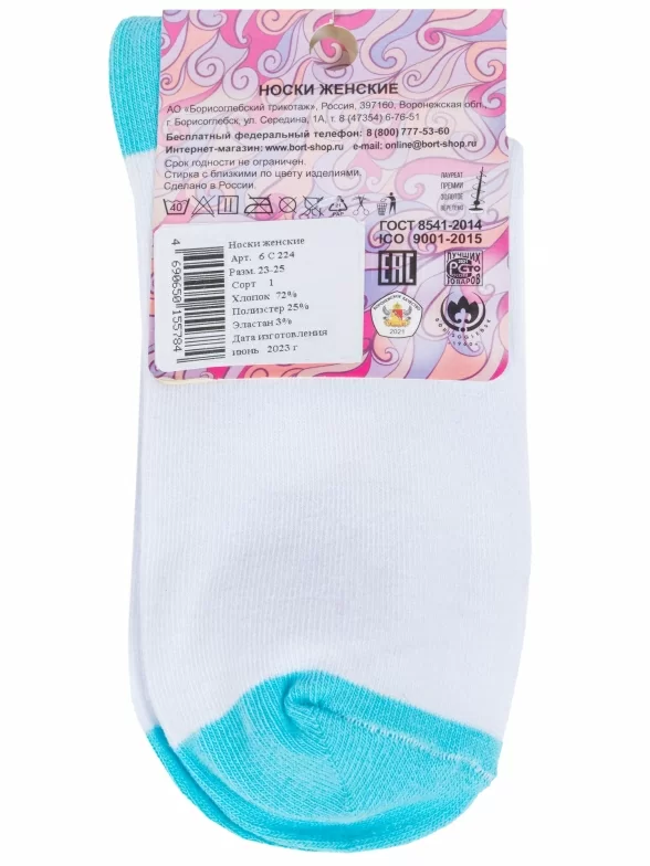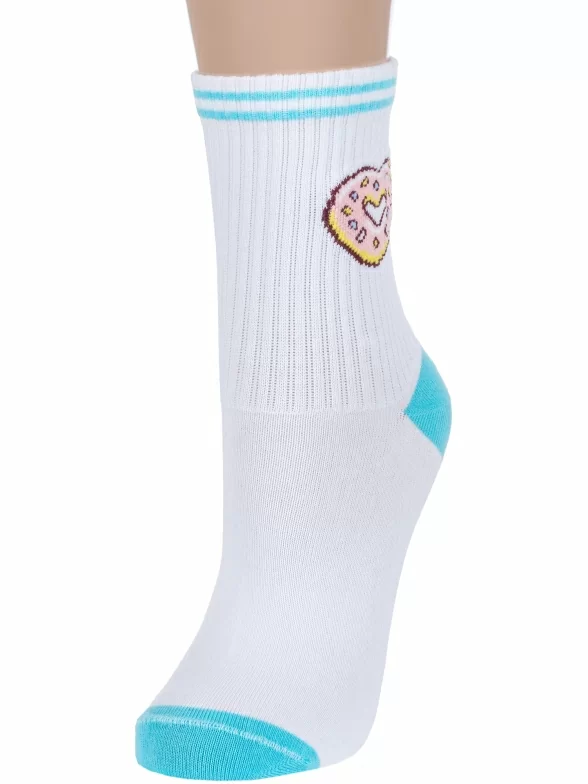 Круглогодичные средней длины женские носки, цвет белый, повседневные, шов обычный (не бесшовные), принт (рисунок): контрастные пятка / мысок / резинка, еда и напитки, с узором, состав: 72% хлопок, 25% полиэстер, 3% эластан, арт. 6С224. Производитель «АО Борисоглебский трикотаж, Воронежская обл, Россия» под брендом «Борисоглебский трикотаж».