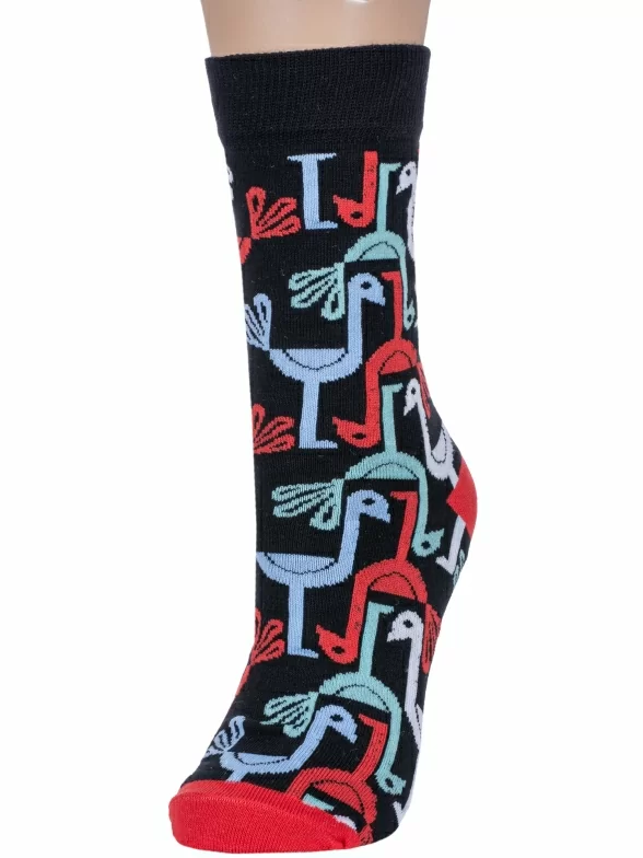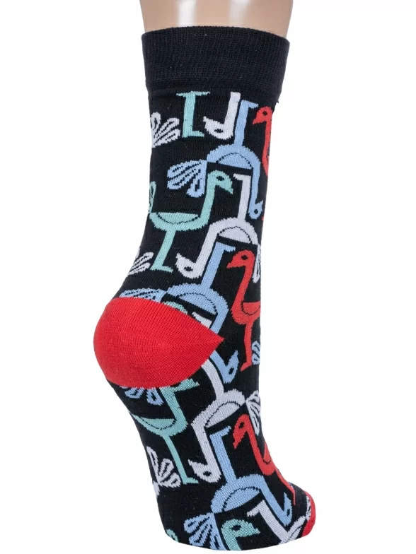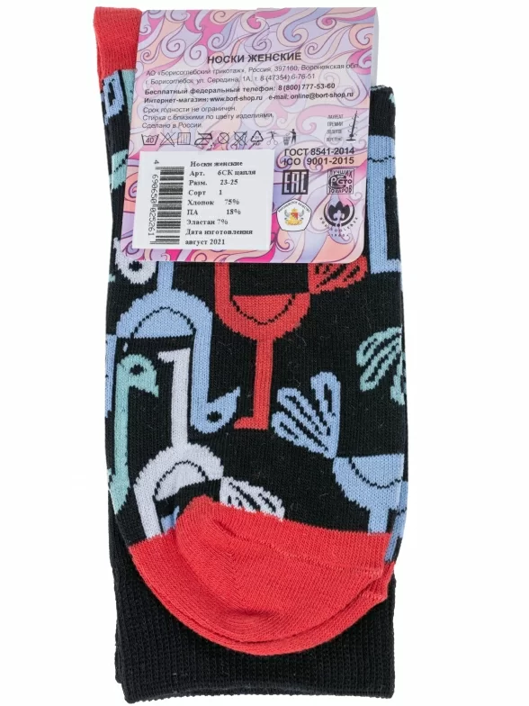 Круглогодичные укороченные женские носки, цвет черный, повседневные, шов обычный (не бесшовные), принт (рисунок): контрастные пятка / мысок / резинка, животные, с узором, состав: 75% хлопок, 18% полиамид, 7% эластан, арт. 6СК. Производитель «АО Борисоглебский трикотаж, Воронежская обл, Россия» под брендом «Борисоглебский трикотаж».
