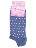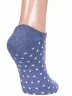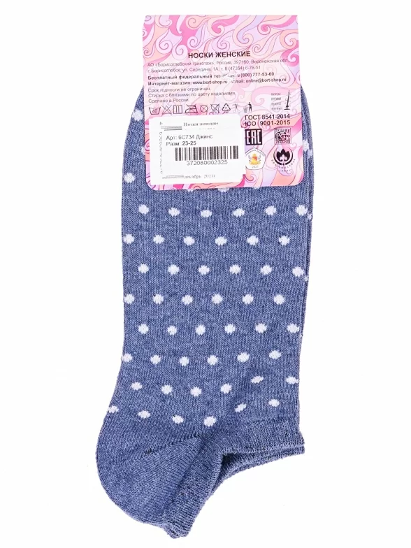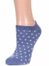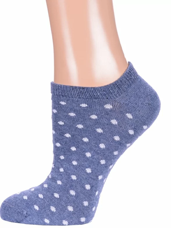 Межсезонные или летние ультракороткие женские носки, цвет синий-джинс, классические, шов кеттельный (бесшовная технология), принт (рисунок): мелкий принт, горох / точка, с узором, состав: 60% хлопок, 37% полиэстер, 3% эластан, арт. 6С734. Производитель «АО Борисоглебский трикотаж, Воронежская обл, Россия» под брендом «Борисоглебский трикотаж».
