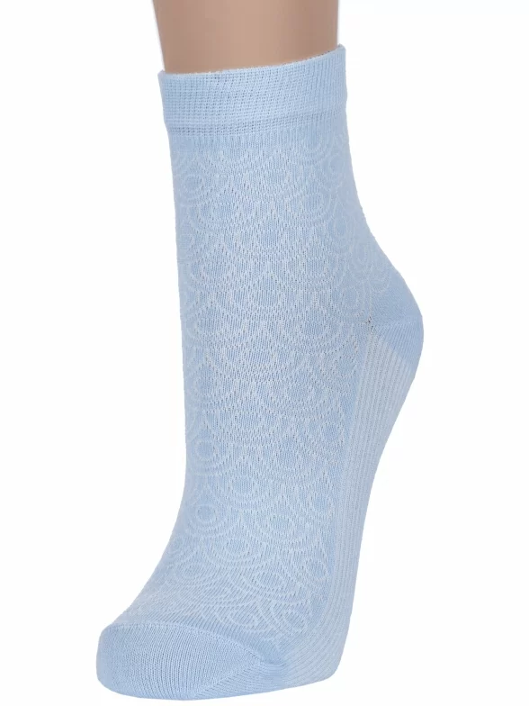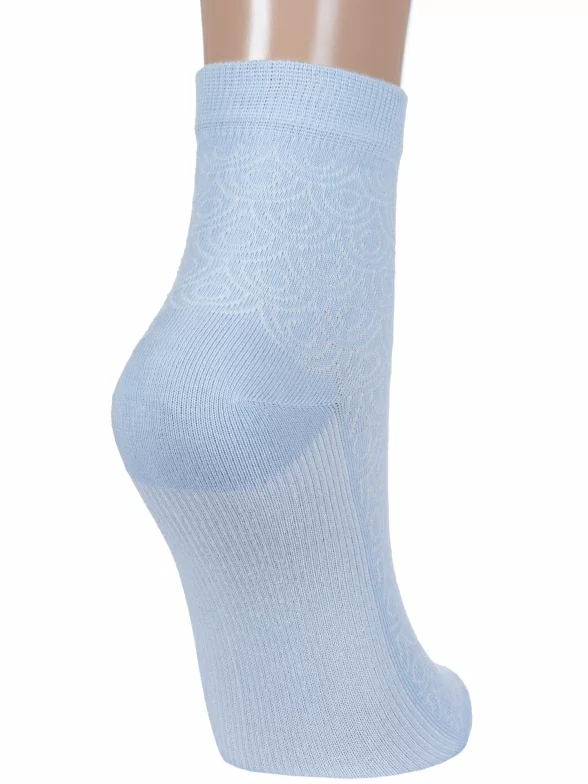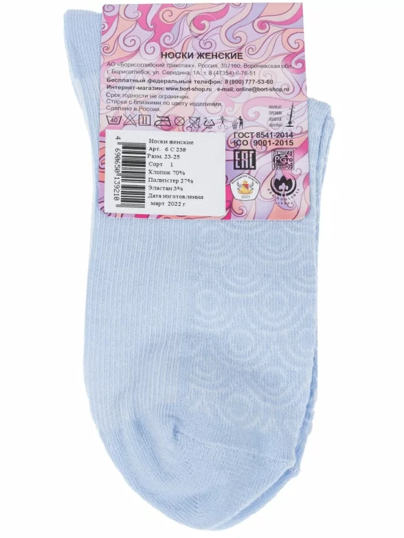 Межсезонные или летние укороченные женские носки, цвет голубой, ажурные, классические, шов обычный (не бесшовные), принт (рисунок): орнамент, с узором, однотонный, состав: 70% хлопок, 27% полиэстер, 3% эластан, арт. 6С238. Производитель «АО Борисоглебский трикотаж, Воронежская обл, Россия» под брендом «Борисоглебский трикотаж».