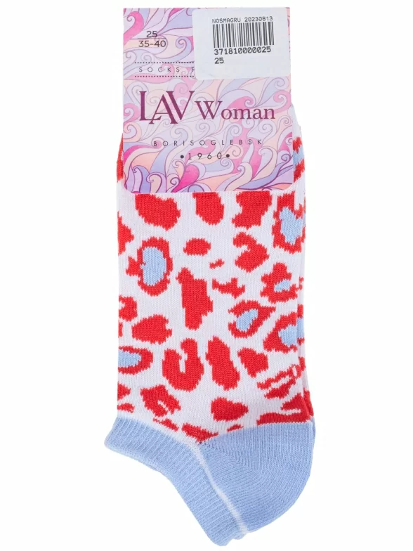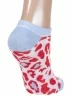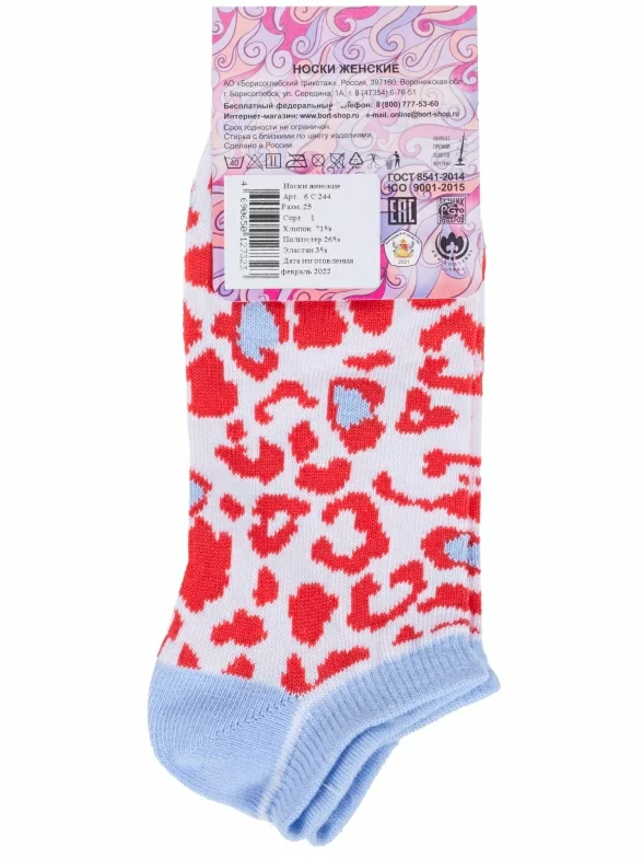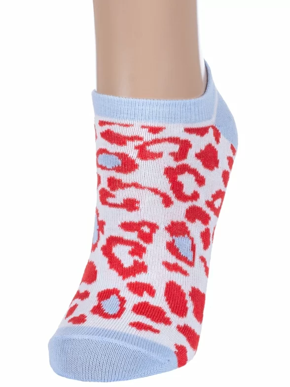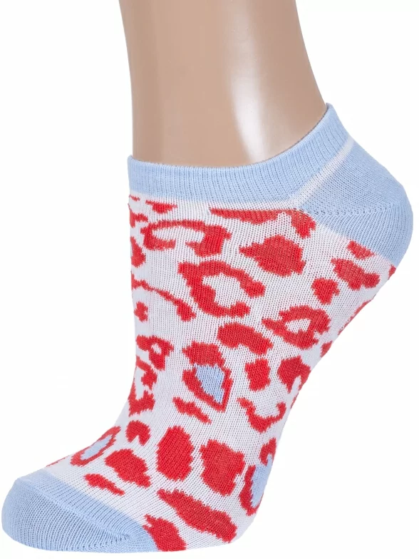 Летние или круглогодичные ультракороткие женские носки, цвет многоцветные (мультиколор)-голубой, повседневные, шов обычный (не бесшовные), принт (рисунок): леопардовый, контрастные пятка / мысок / резинка, с узором, состав: 71% хлопок, 26% полиэстер, 3% эластан, арт. 6С244. Производитель «АО Борисоглебский трикотаж, Воронежская обл, Россия» под брендом «Борисоглебский трикотаж».