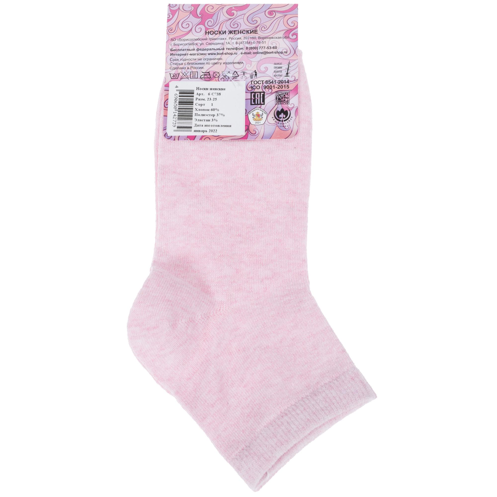 Круглогодичные укороченные женские носки, цвет розовый, классические, шов обычный (не бесшовные), принт (рисунок): однотонный, без рисунков/узоров, состав: 60% хлопок, 37% полиэстер, 3% эластан, арт. 6С738. Производитель «АО Борисоглебский трикотаж, Воронежская обл, Россия» под брендом «Борисоглебский трикотаж».