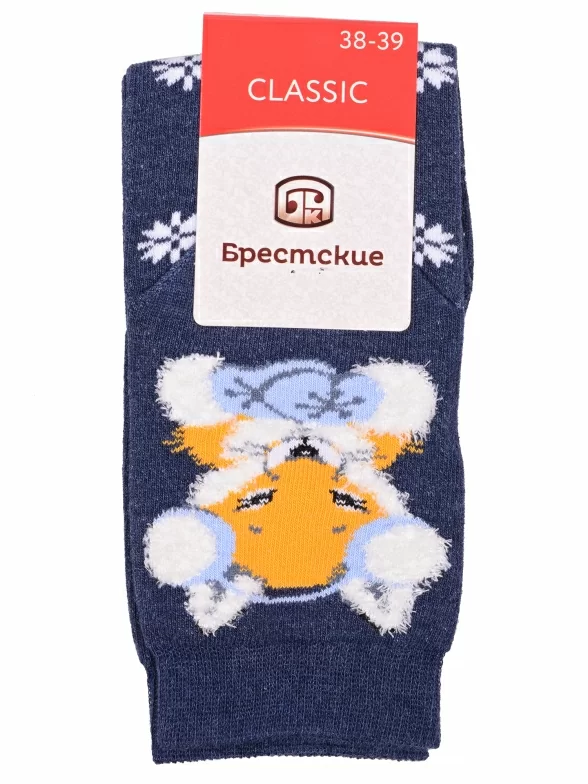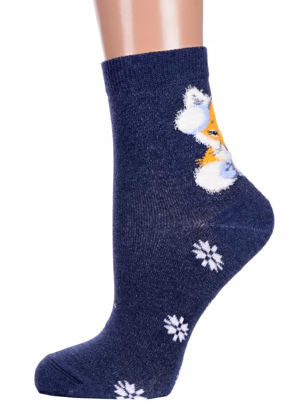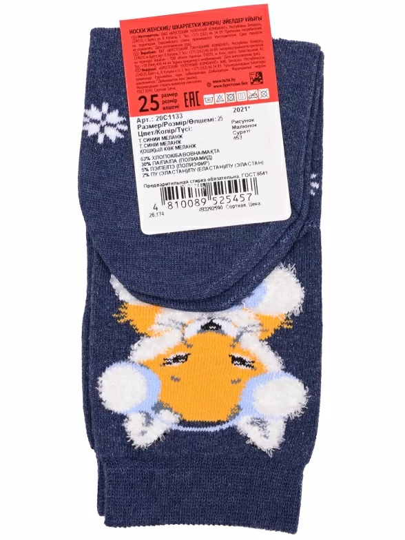 Круглогодичные укороченные женские носки, цвет темно-синий, повседневные, шов плоский, принт (рисунок): пушистый, новый год, зимний, животные, с узором, крупные контрастные рисунки, состав: 63% хлопок, 30% полиамид, 5% полиэстер, 2% эластан, арт. 20С1133. Производитель «Брестский чулочный комбинат ОАО, Беларусь» под брендом «Брестские (бчк)».