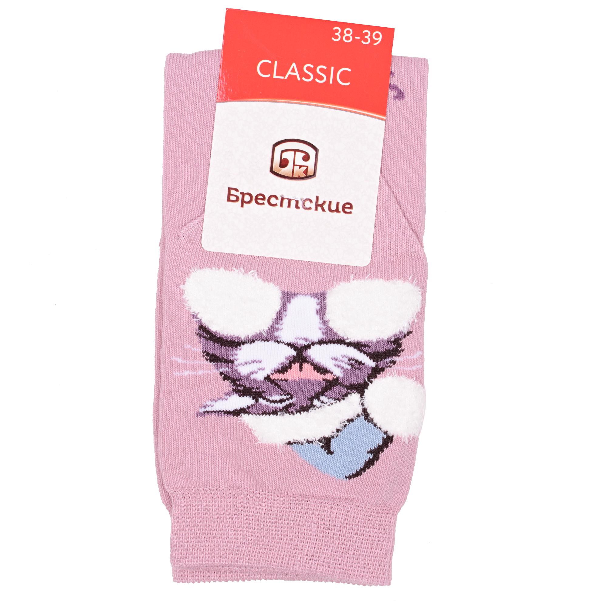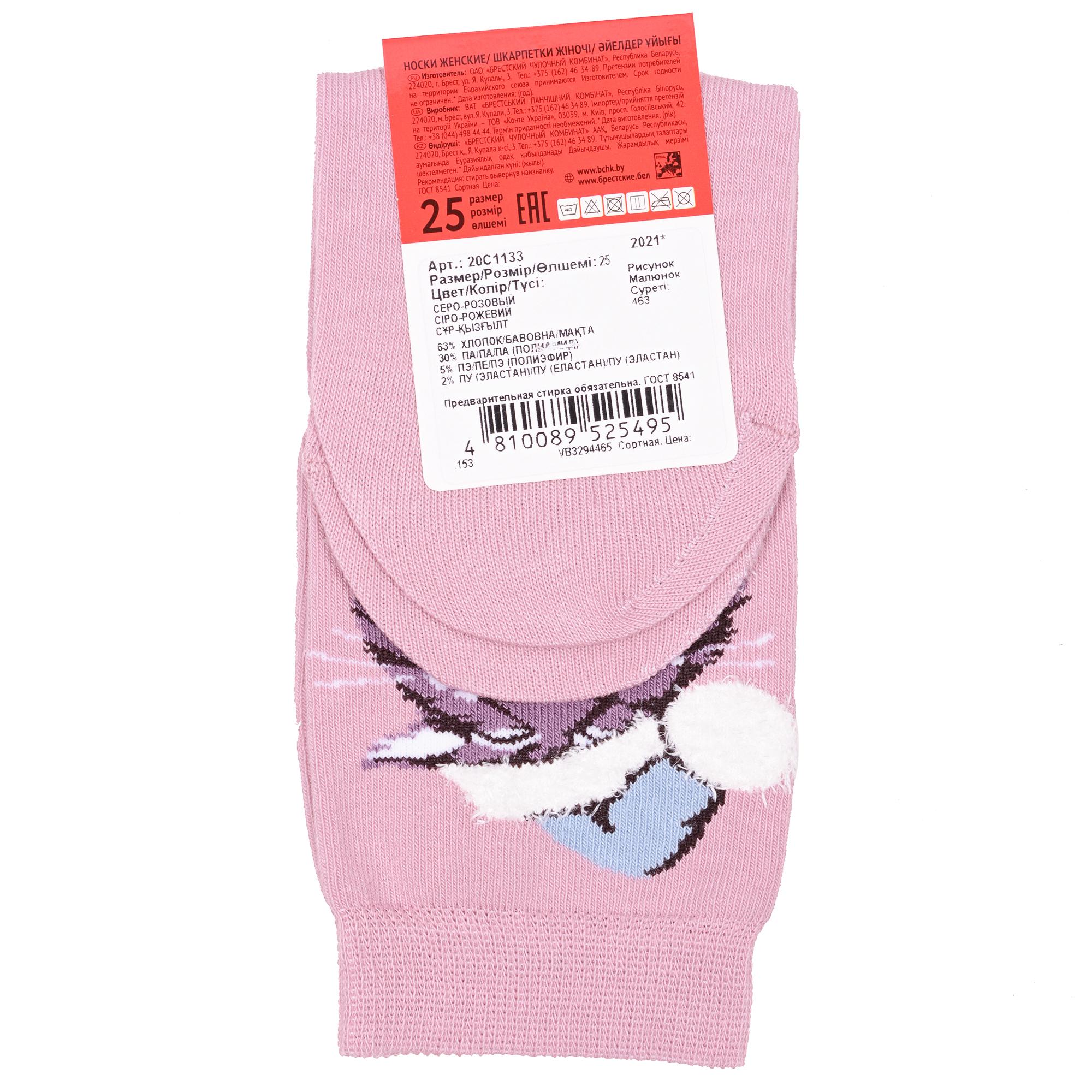 Круглогодичные укороченные женские носки, цвет розовый, повседневные, шов плоский, принт (рисунок): пушистый, новый год, надписи, зимний, животные, с узором, состав: 63% хлопок, 30% полиамид, 5% полиэстер, 2% эластан, арт. 20С1133. Производитель «Брестский чулочный комбинат ОАО, Беларусь» под брендом «Брестские (бчк)».