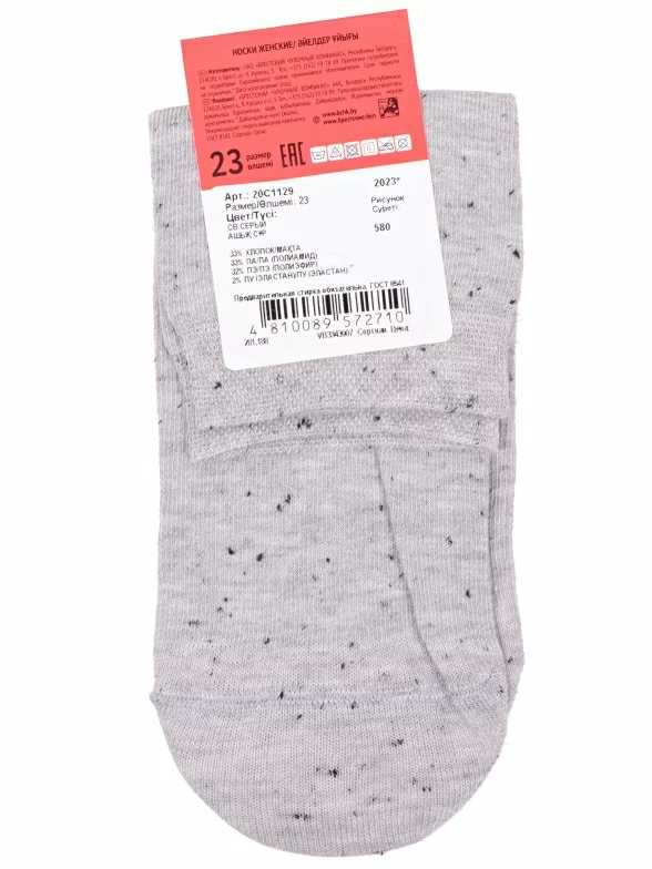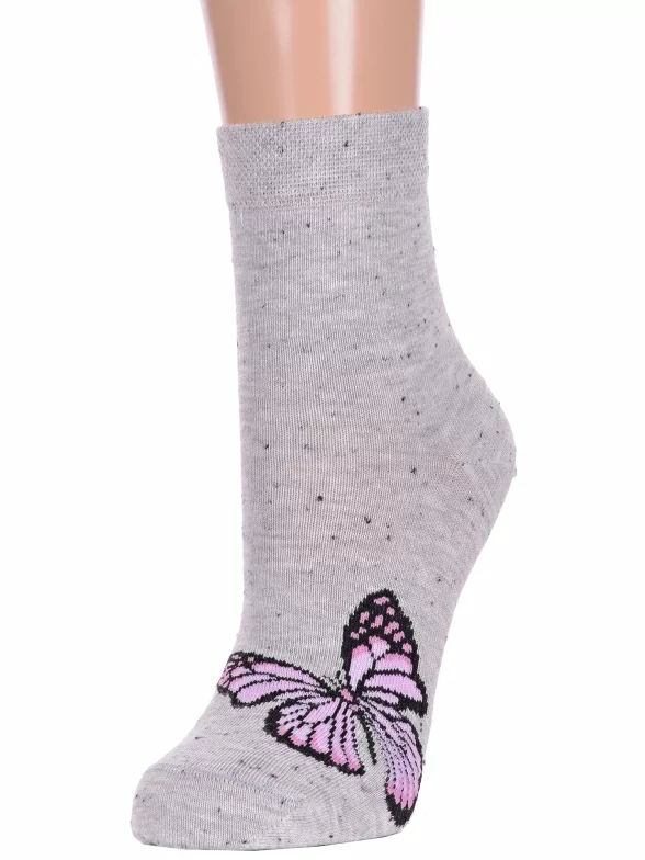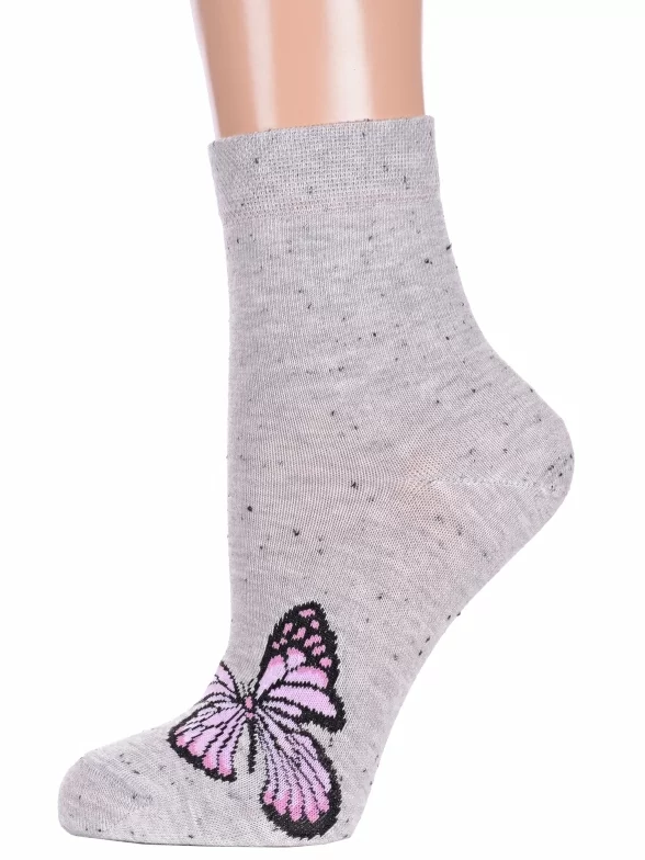 Круглогодичные укороченные женские носки, цвет светло-серый, повседневные, шов плоский, принт (рисунок): мелкий принт, бабочки / бантики, с узором, состав: 33% хлопок, 33% полиамид, 32% полиэстер, 2% эластан, арт. 20С1129. Производитель «Брестский чулочный комбинат ОАО, Беларусь» под брендом «Брестские (бчк)».