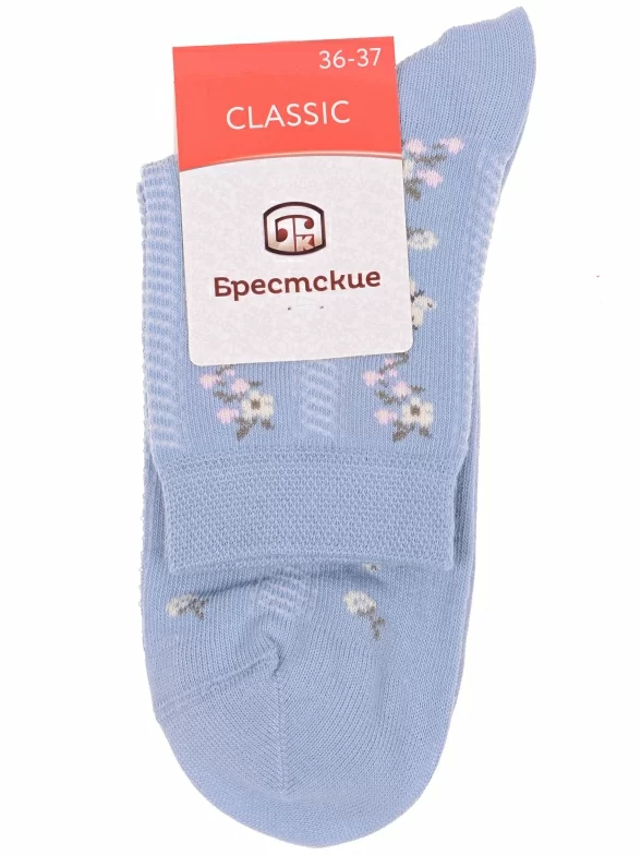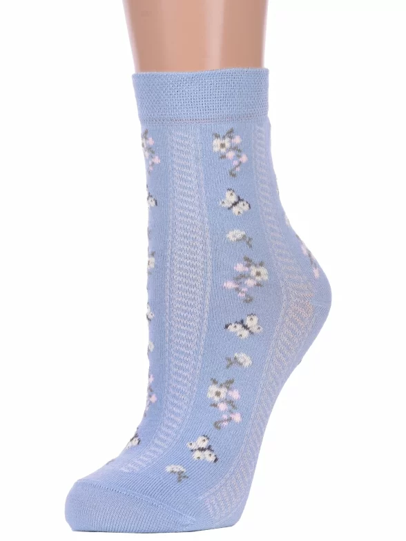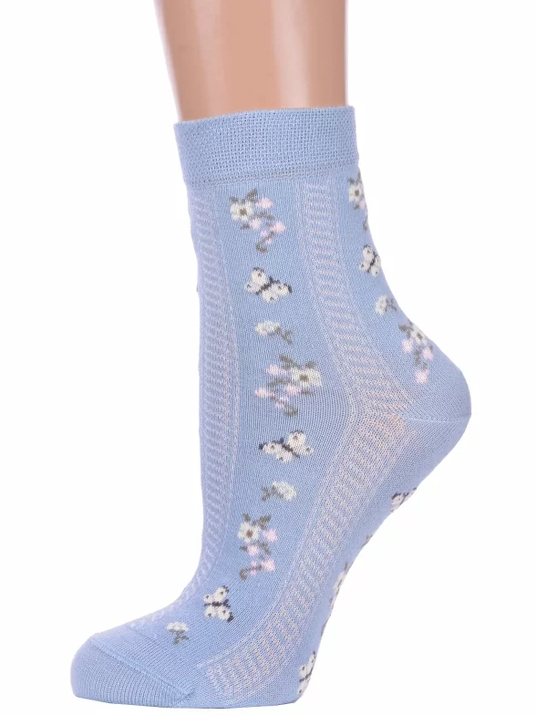 Летние укороченные женские носки, цвет голубой, повседневные, ажурные, шов кеттельный (бесшовная технология), принт (рисунок): цветы / растения, с узором, состав: 70% хлопок, 28% полиэстер, 2% полиуретан, арт. 14с1100. Производитель «Брестский чулочный комбинат ОАО, Беларусь» под брендом «Брестские (бчк)».
