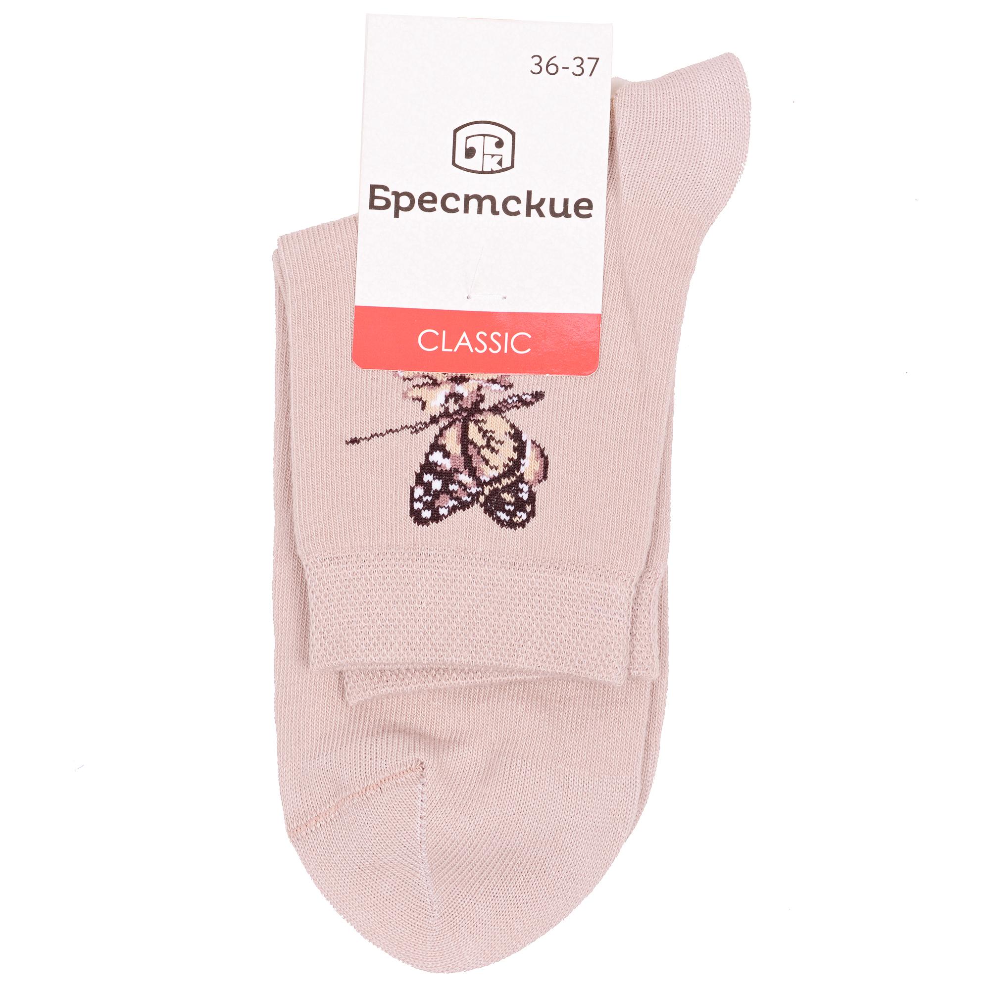 Круглогодичные укороченные женские носки, цвет бежевый, повседневные, шов кеттельный (бесшовная технология), принт (рисунок): цветы / растения, животные, с узором, состав: 70% хлопок, 28% полиэстер, 2% эластан, арт. 14с1100. Производитель «Брестский чулочный комбинат ОАО, Беларусь» под брендом «Брестские (бчк)».