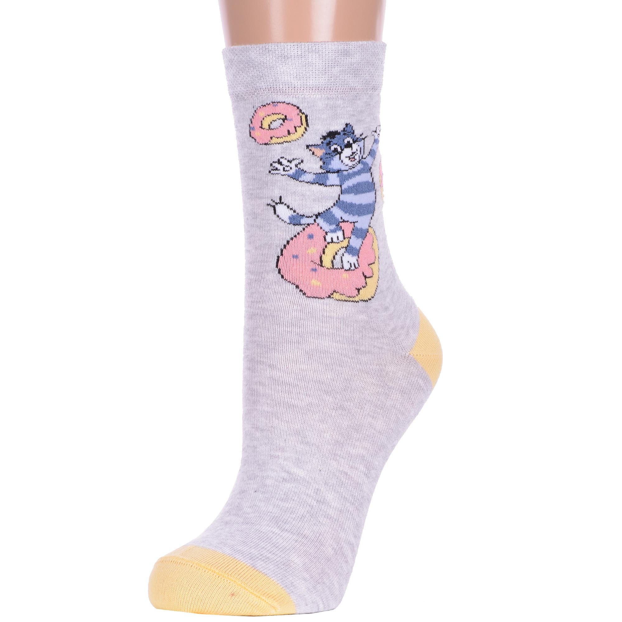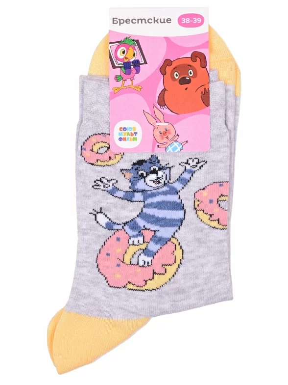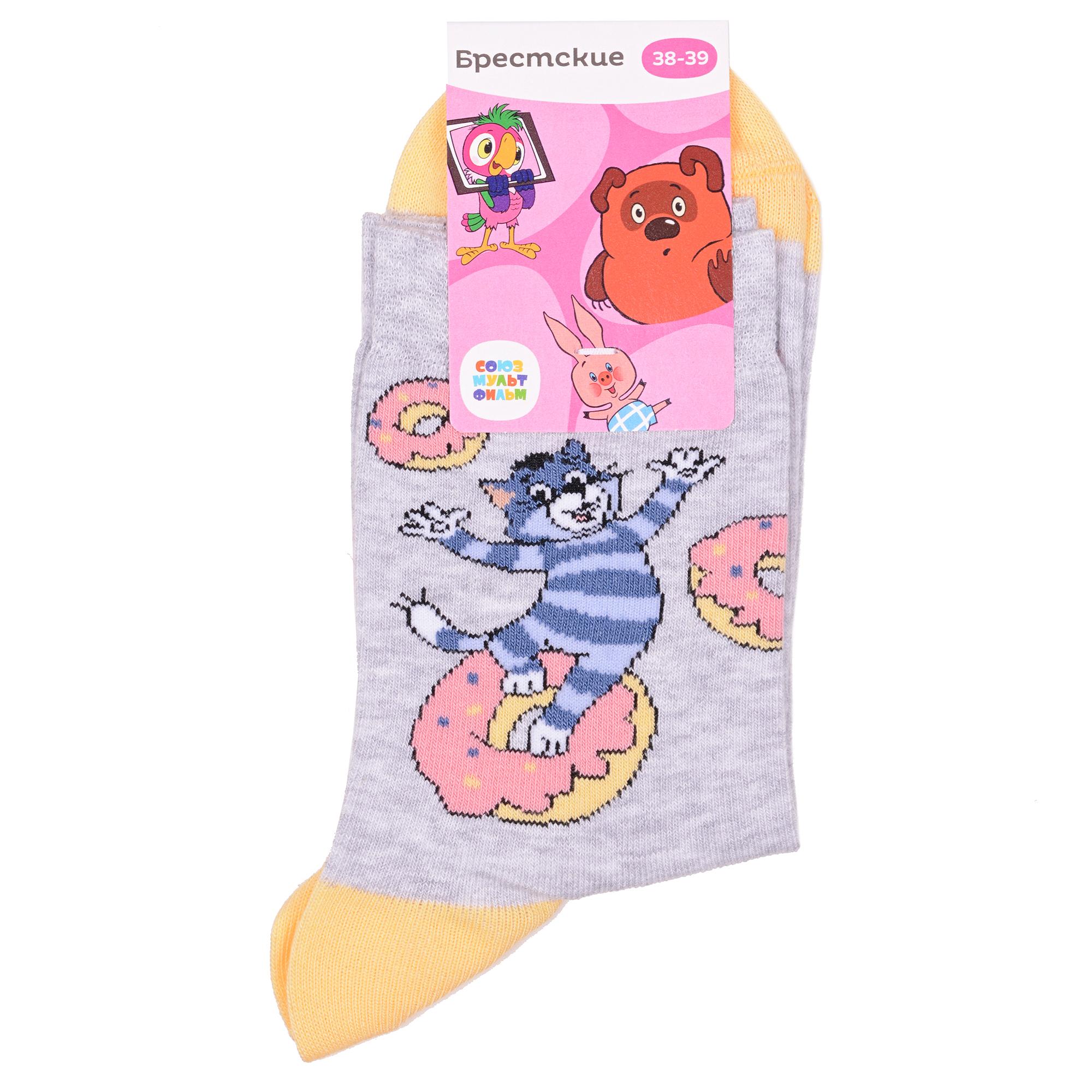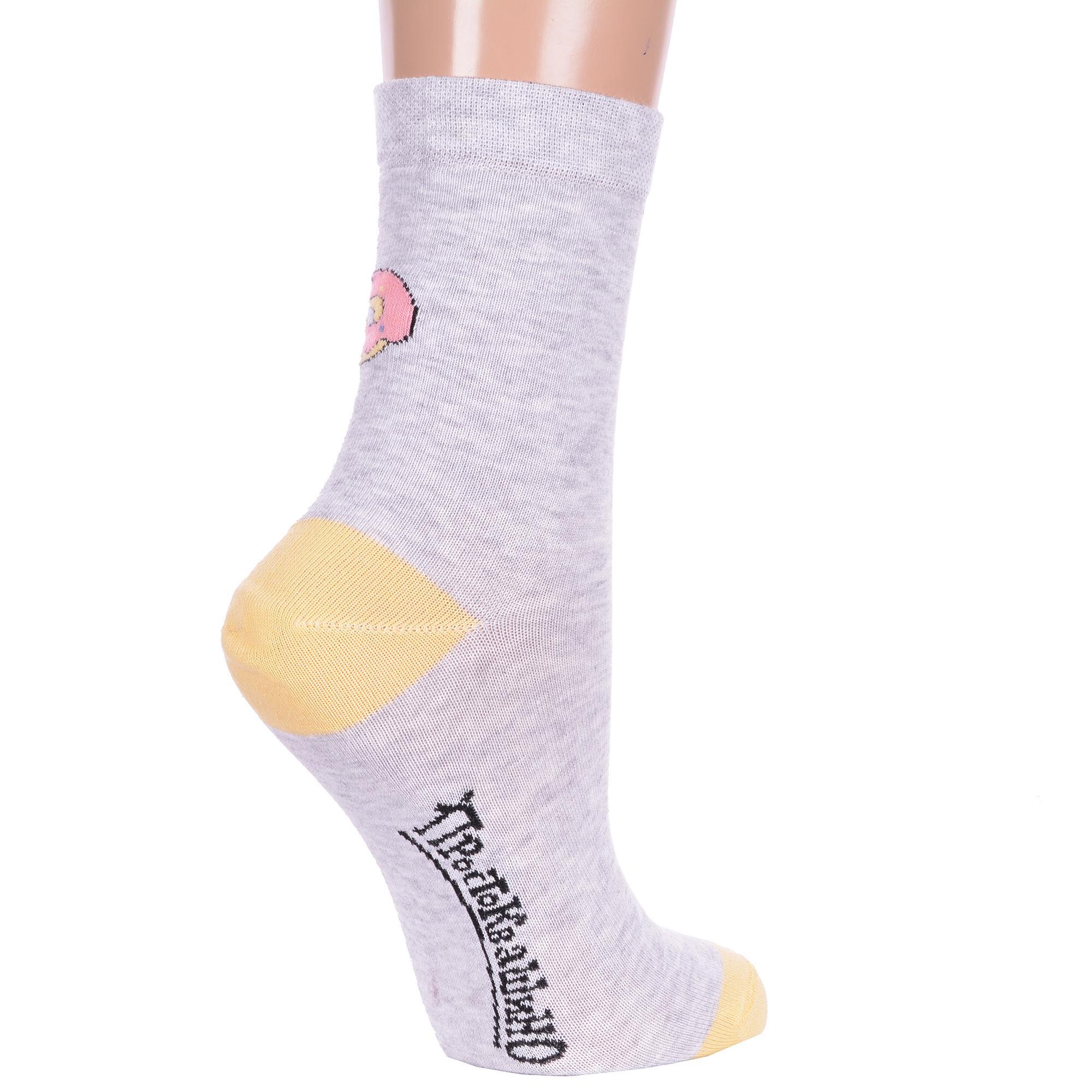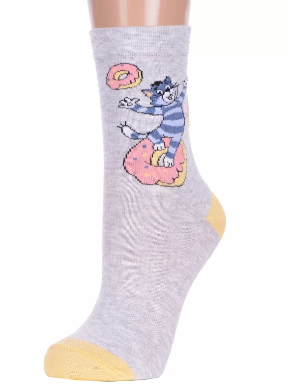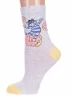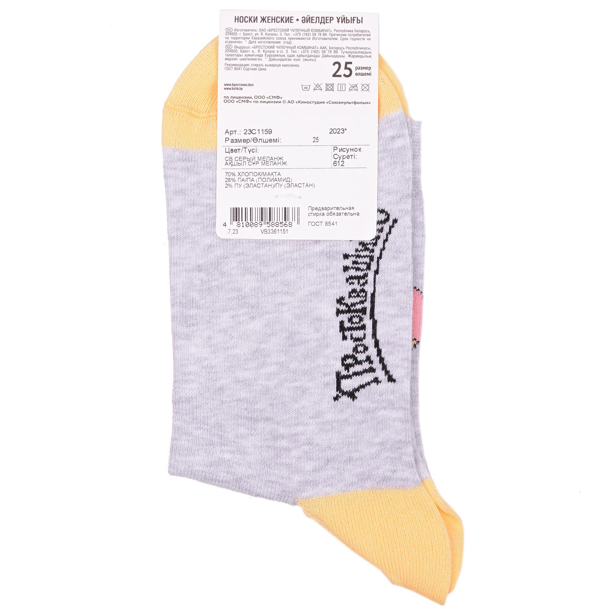 Круглогодичные укороченные женские носки, цвет светло-серый, повседневные, шов кеттельный (бесшовная технология), принт (рисунок): фильмы / сериалы / мультики, контрастные пятка / мысок / резинка, животные, еда и напитки, с узором, крупные контрастные рисунки, состав: 70% хлопок, 28% полиамид, 2% эластан, арт. 23С1159. Производитель «Брестский чулочный комбинат ОАО, Беларусь» под брендом «Брестские (бчк)».