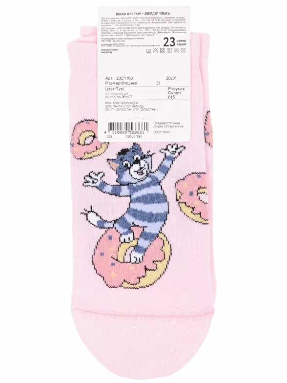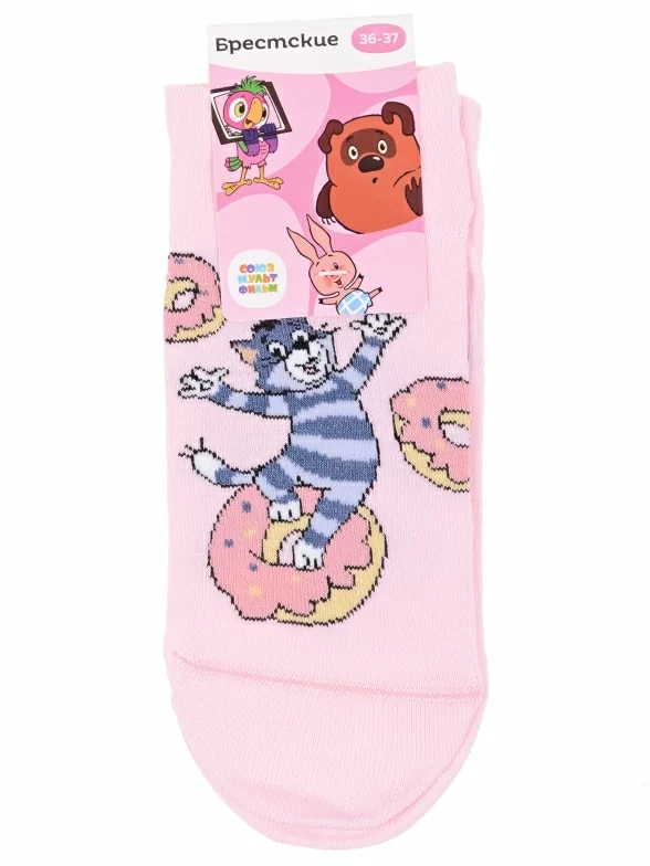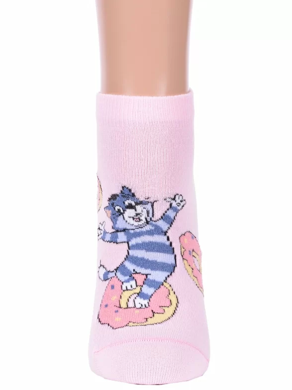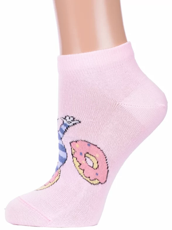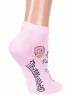 Летние короткие женские носки, цвет розовый, повседневные, шов кеттельный (бесшовная технология), принт (рисунок): фильмы / сериалы / мультики, надписи, животные, еда и напитки, с узором, состав: 66% хлопок, 32% полиамид, 2% полиуретан, арт. 23С1160. Производитель «Брестский чулочный комбинат ОАО, Беларусь» под брендом «Брестские (бчк)».