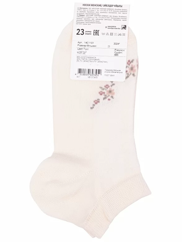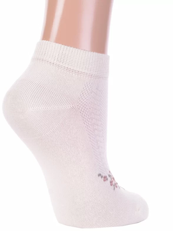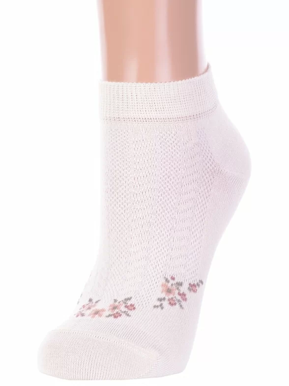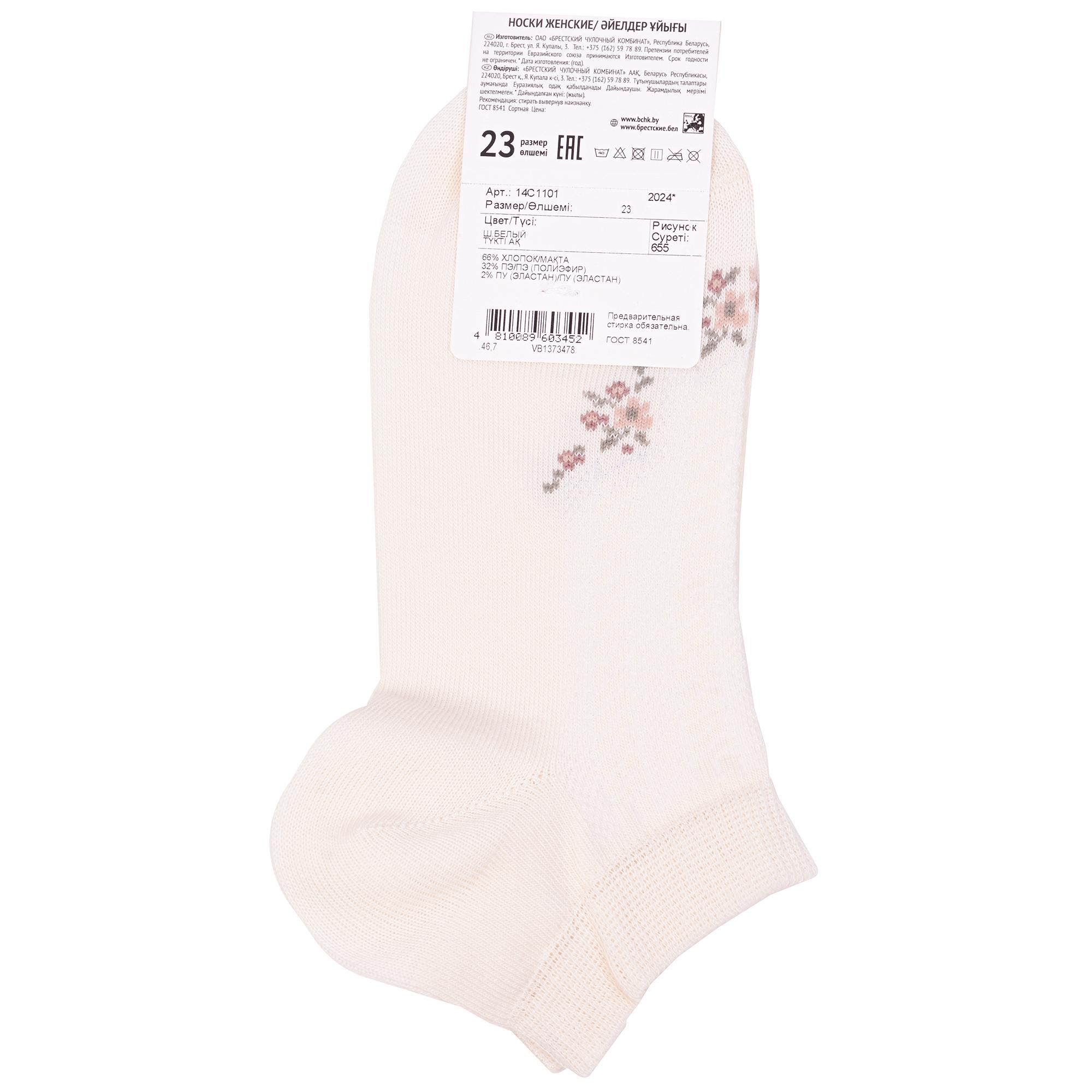 Летние короткие женские носки, цвет белый, повседневные, в сеточку, шов кеттельный (бесшовная технология), принт (рисунок): цветы / растения, с узором, состав: 66% хлопок, 32% полиэстер, 2% эластан, арт. 14с1101. Производитель «Брестский чулочный комбинат ОАО, Беларусь» под брендом «Брестские (бчк)».