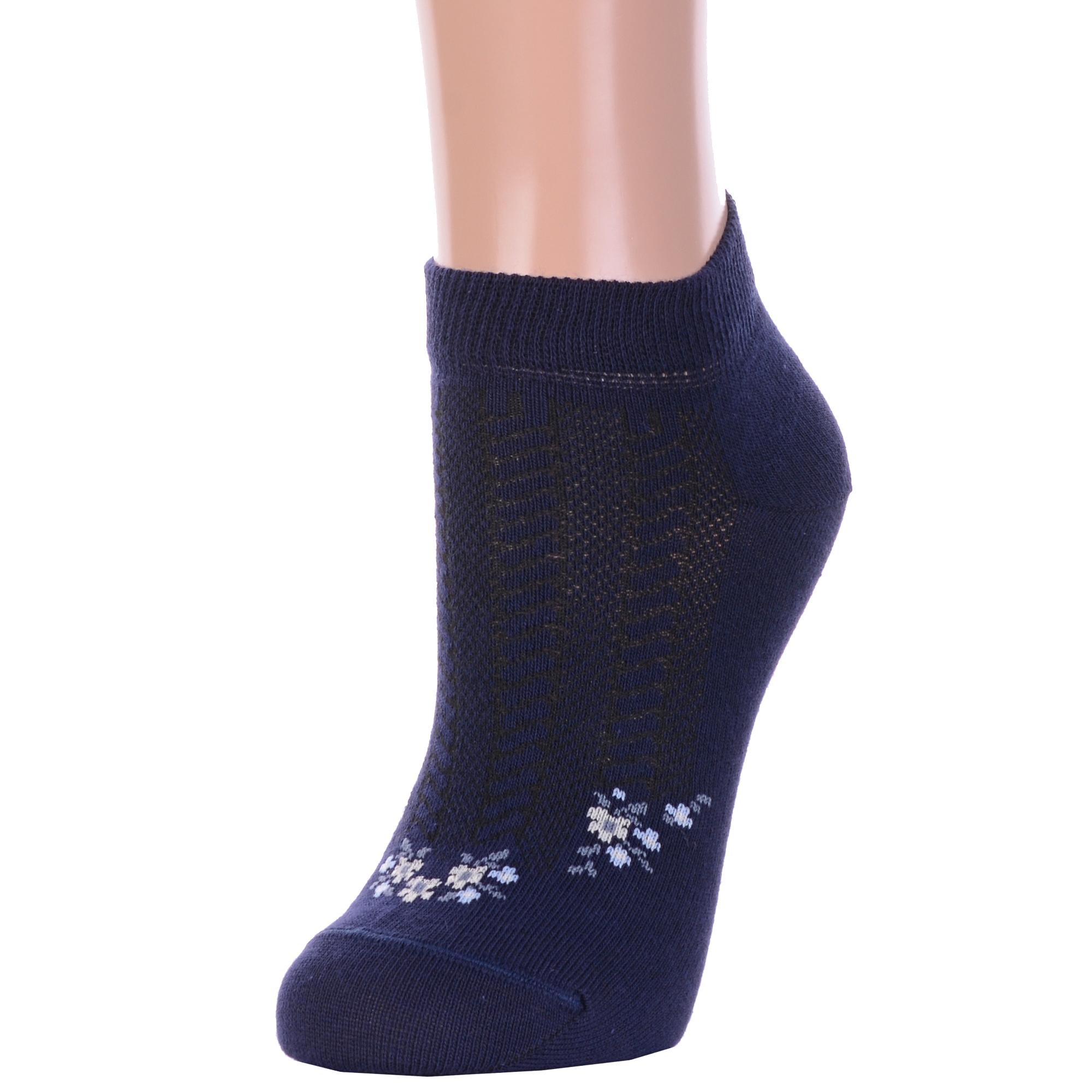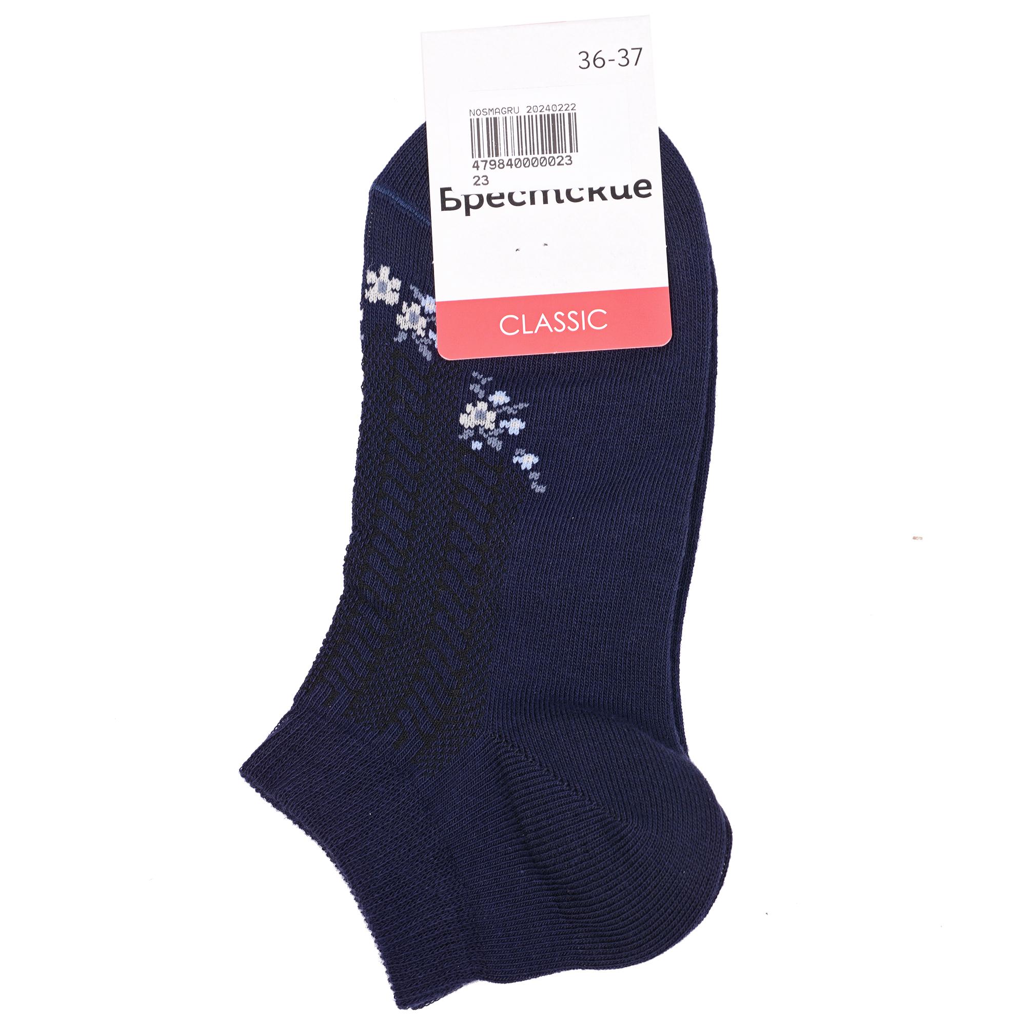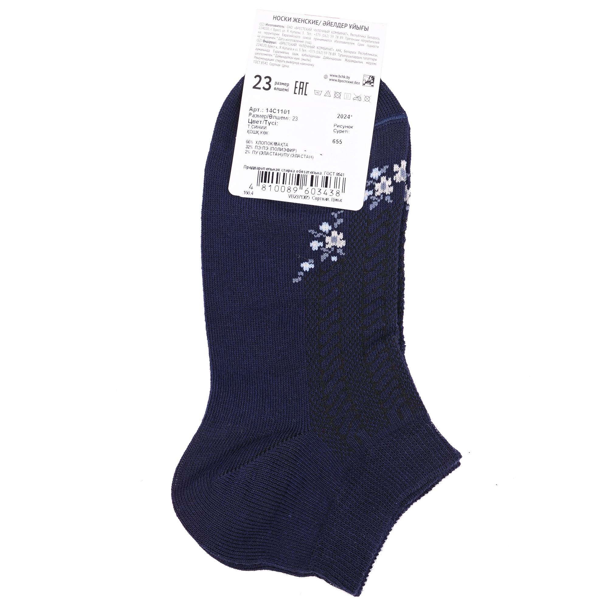 Летние короткие женские носки, цвет темно-синий, повседневные, в сеточку, шов кеттельный (бесшовная технология), принт (рисунок): цветы/растения, с узором, состав: 66% хлопок, 32% полиэстер, 2% эластан, арт. 14с1101. Производитель «Брестский чулочный комбинат ОАО, Беларусь» под брендом «Брестские (бчк)».