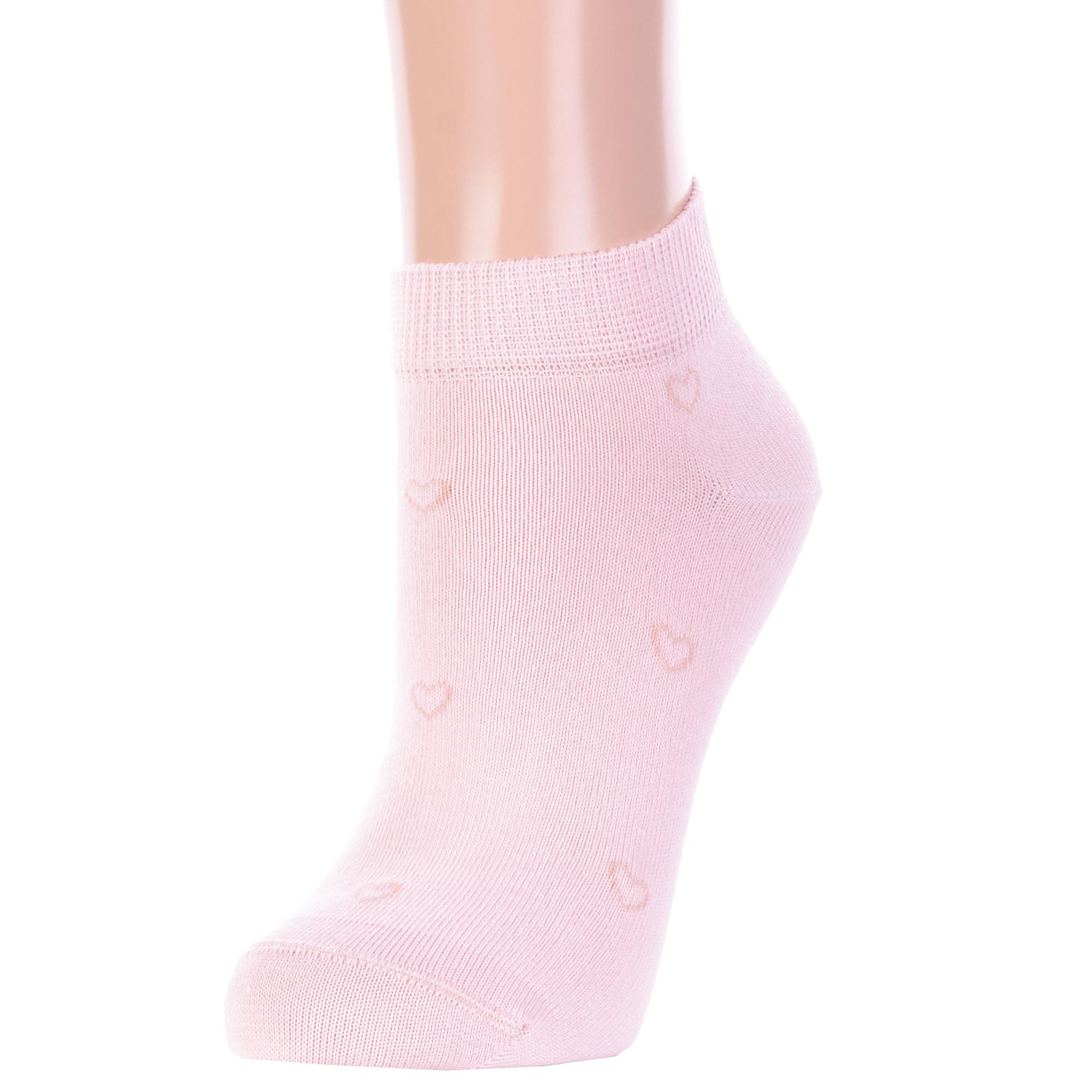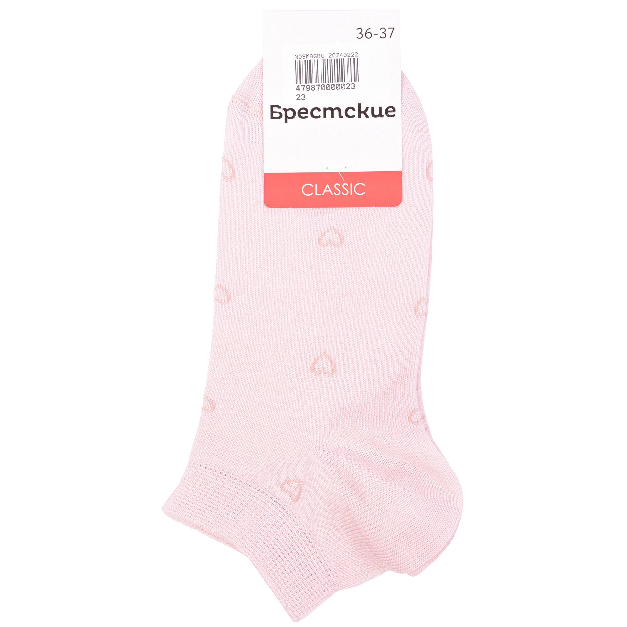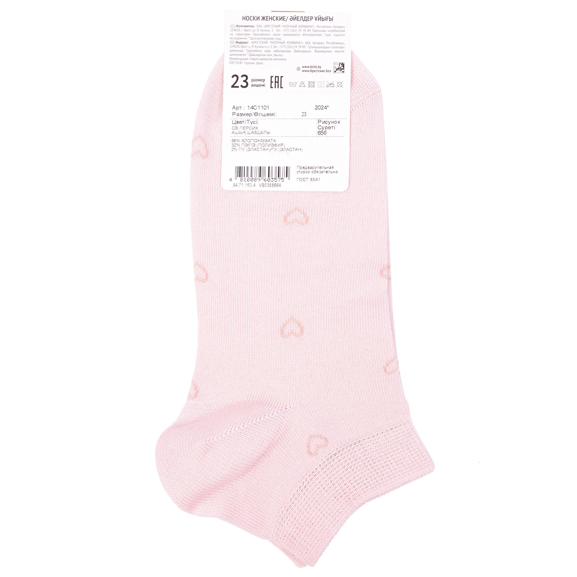 Межсезонные или летние короткие женские носки, цвет розовый, повседневные, шов кеттельный (бесшовная технология), принт (рисунок): сердечки / поцелуи / любовь, однотонный, небольшой рисунок, состав: 66% хлопок, 32% полиэстер, 2% эластан, арт. 14с1101. Производитель «Брестский чулочный комбинат ОАО, Беларусь» под брендом «Брестские (бчк)».