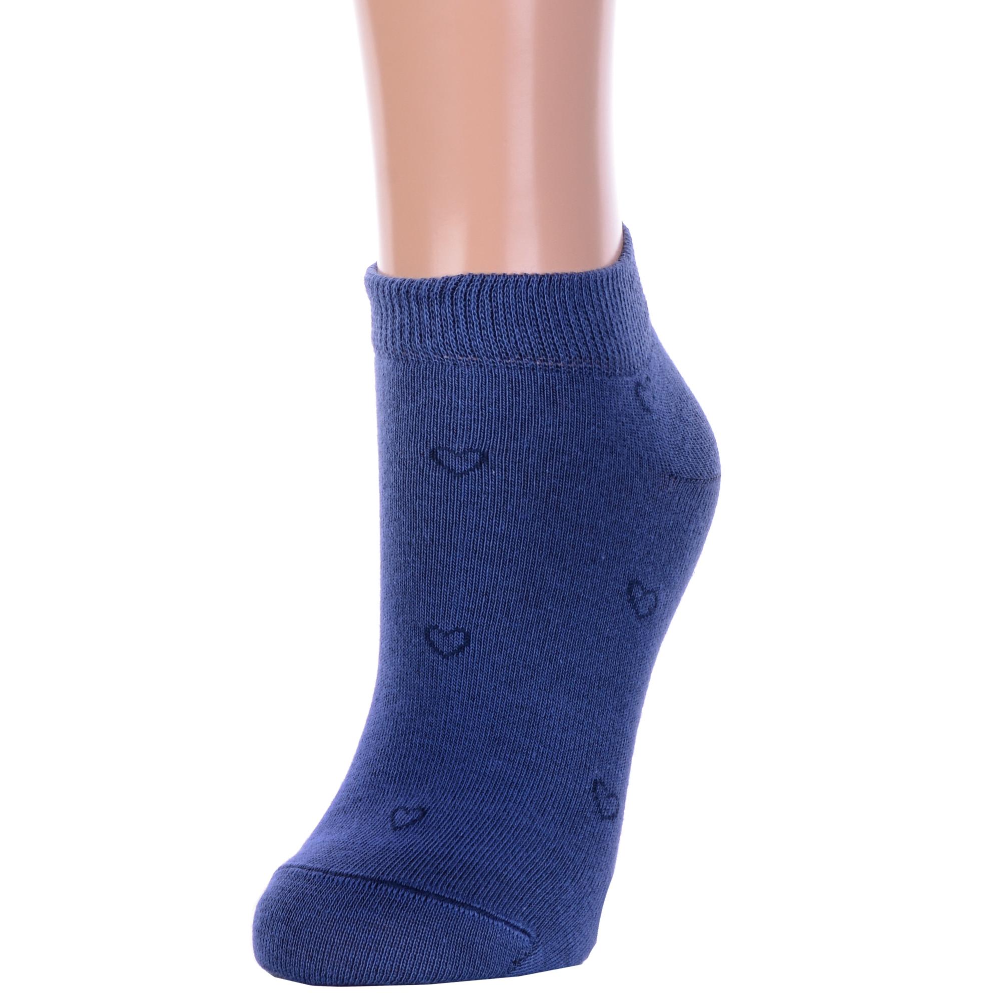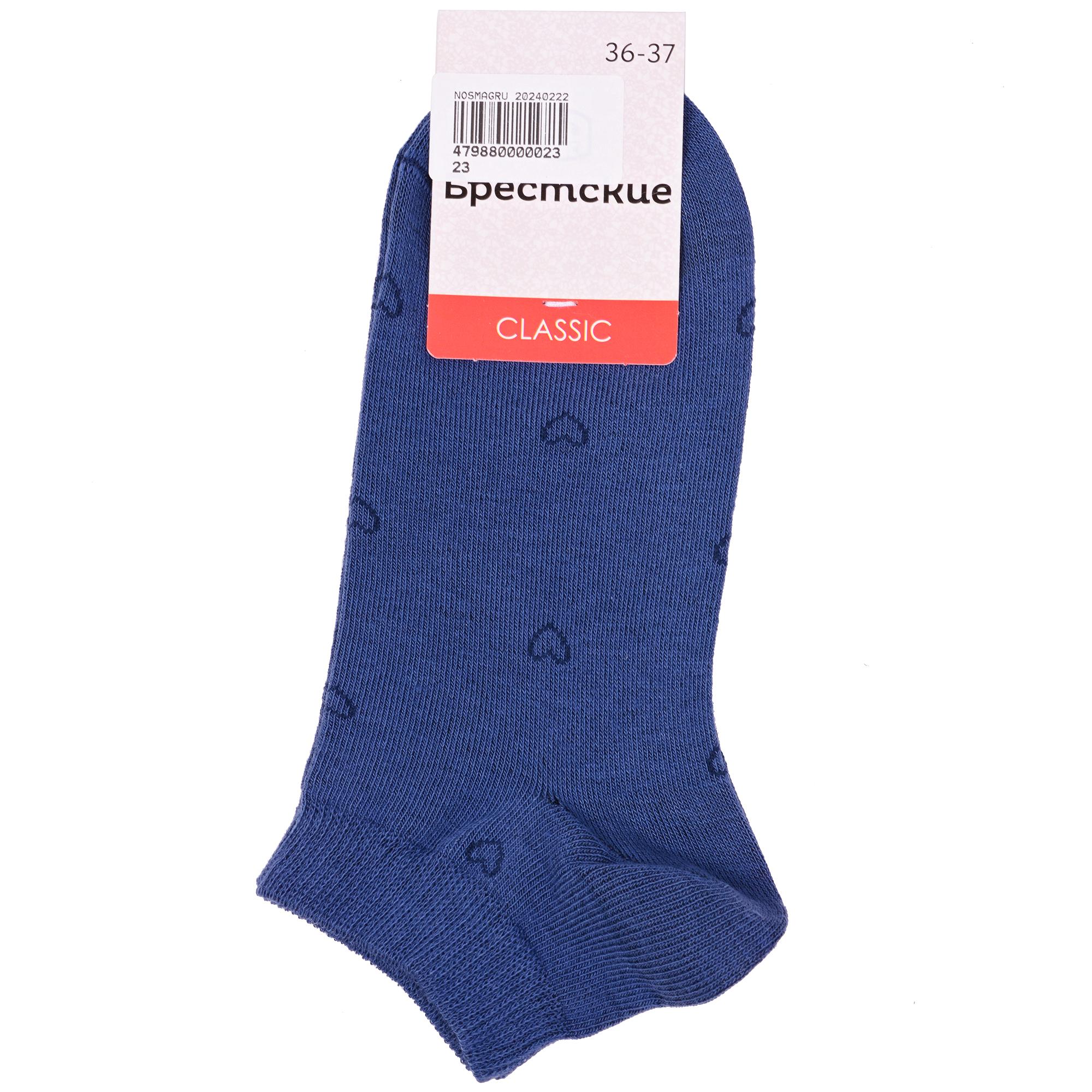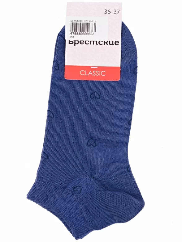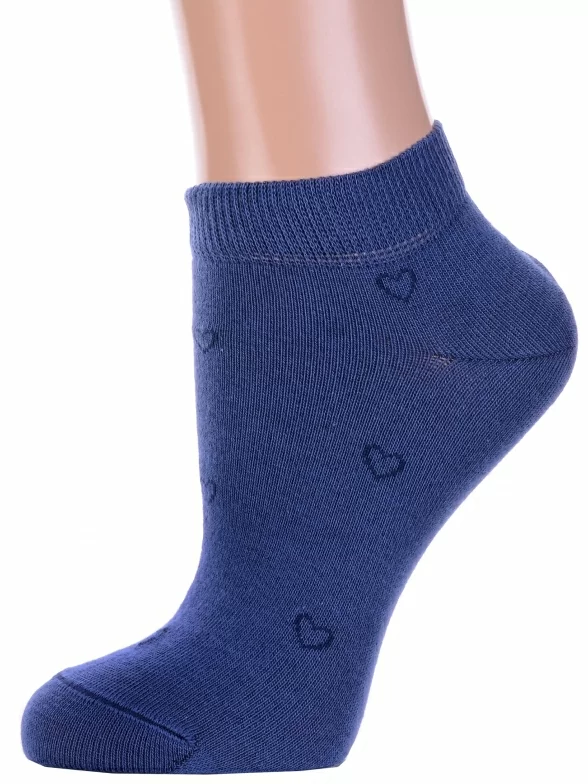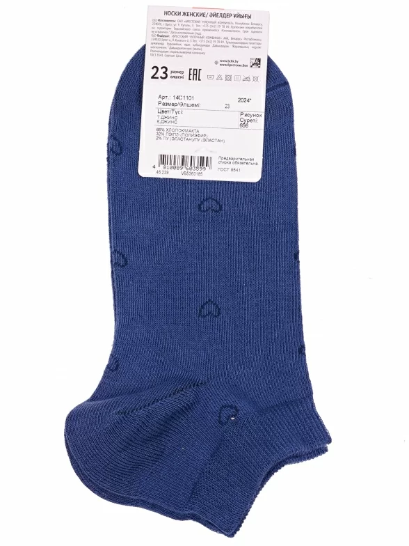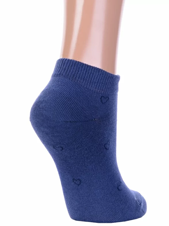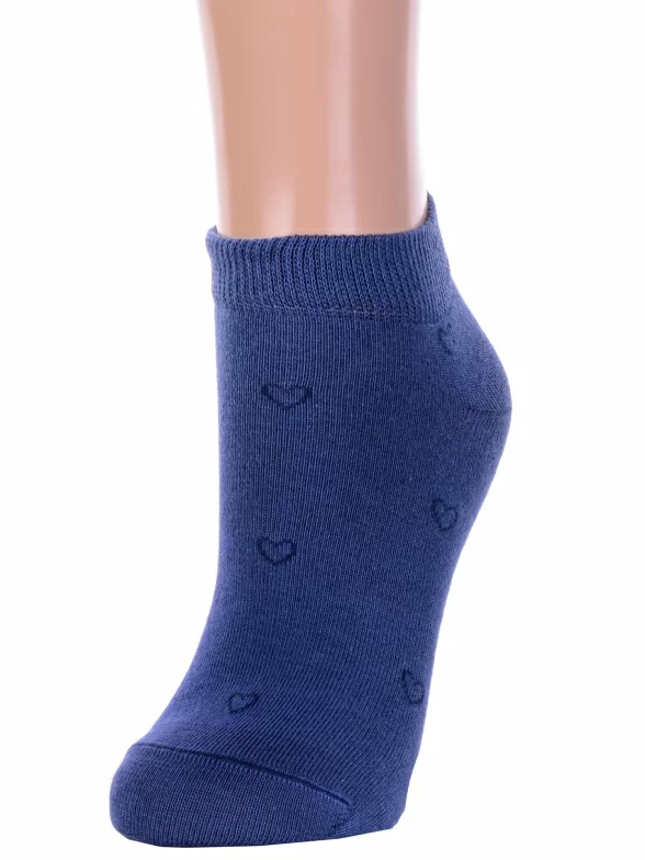 Межсезонные или летние короткие женские носки, цвет джинс, повседневные, шов кеттельный (бесшовная технология), принт (рисунок): сердечки / поцелуи / любовь, с узором, состав: 66% хлопок, 32% полиэстер, 2% эластан, арт. 14с1101. Производитель «Брестский чулочный комбинат ОАО, Беларусь» под брендом «Брестские (бчк)».