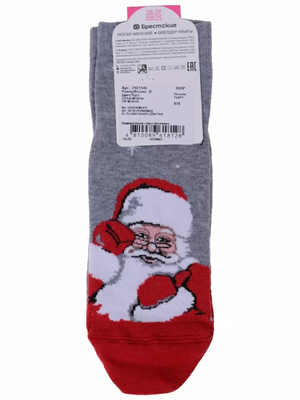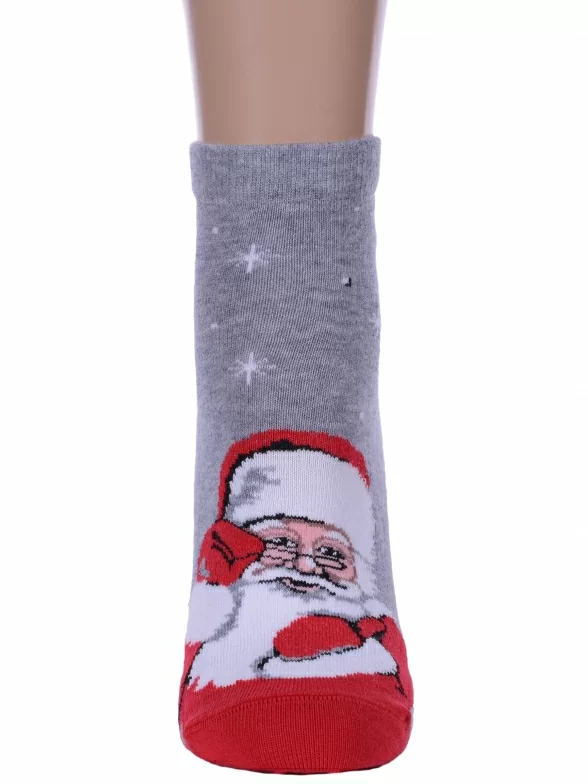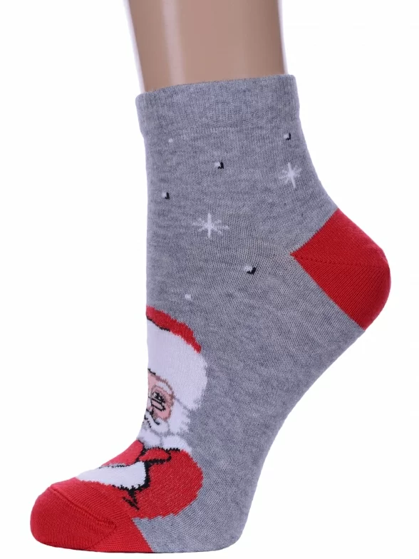 Круглогодичные укороченные женские носки, цвет серый, шов плоский, принт (рисунок): новый год, состав: 66% хлопок, 32% полиамид, 2% эластан, арт. 21С1145. Производитель «Брестский чулочный комбинат ОАО, Беларусь» под брендом «Брестские (бчк)».