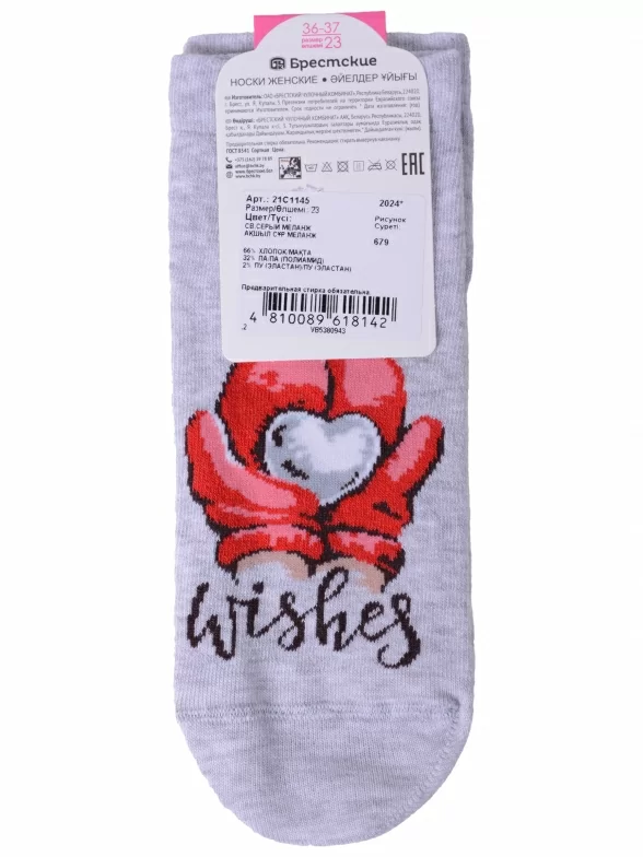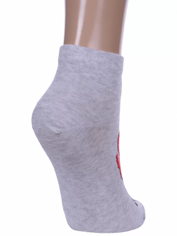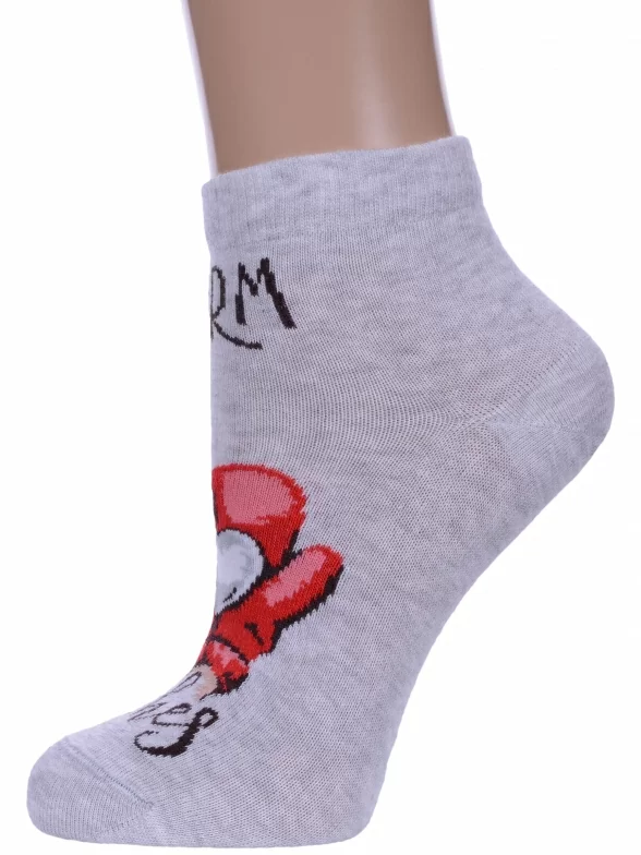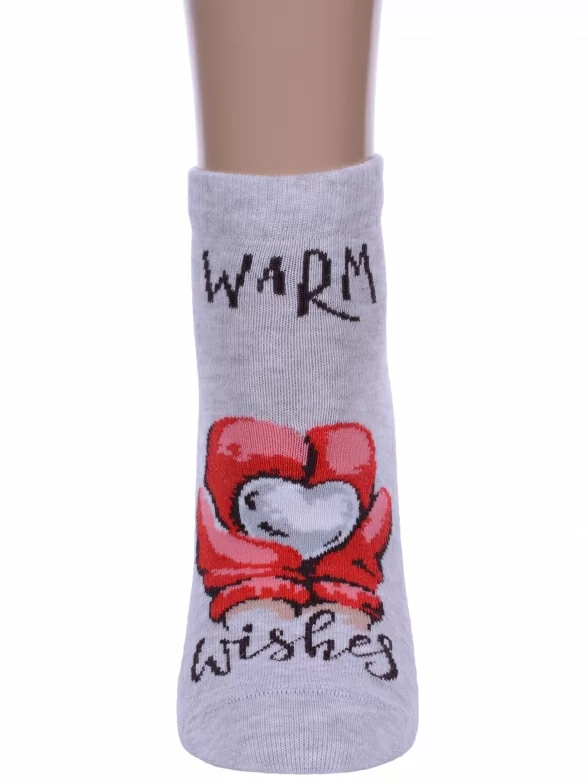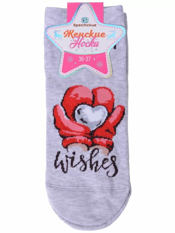 Круглогодичные укороченные женские носки, цвет серый, шов плоский, принт (рисунок): новый год, состав: 66% хлопок, 32% полиамид, 2% эластан, арт. 21С1145. Производитель «Брестский чулочный комбинат ОАО, Беларусь» под брендом «Брестские (бчк)».