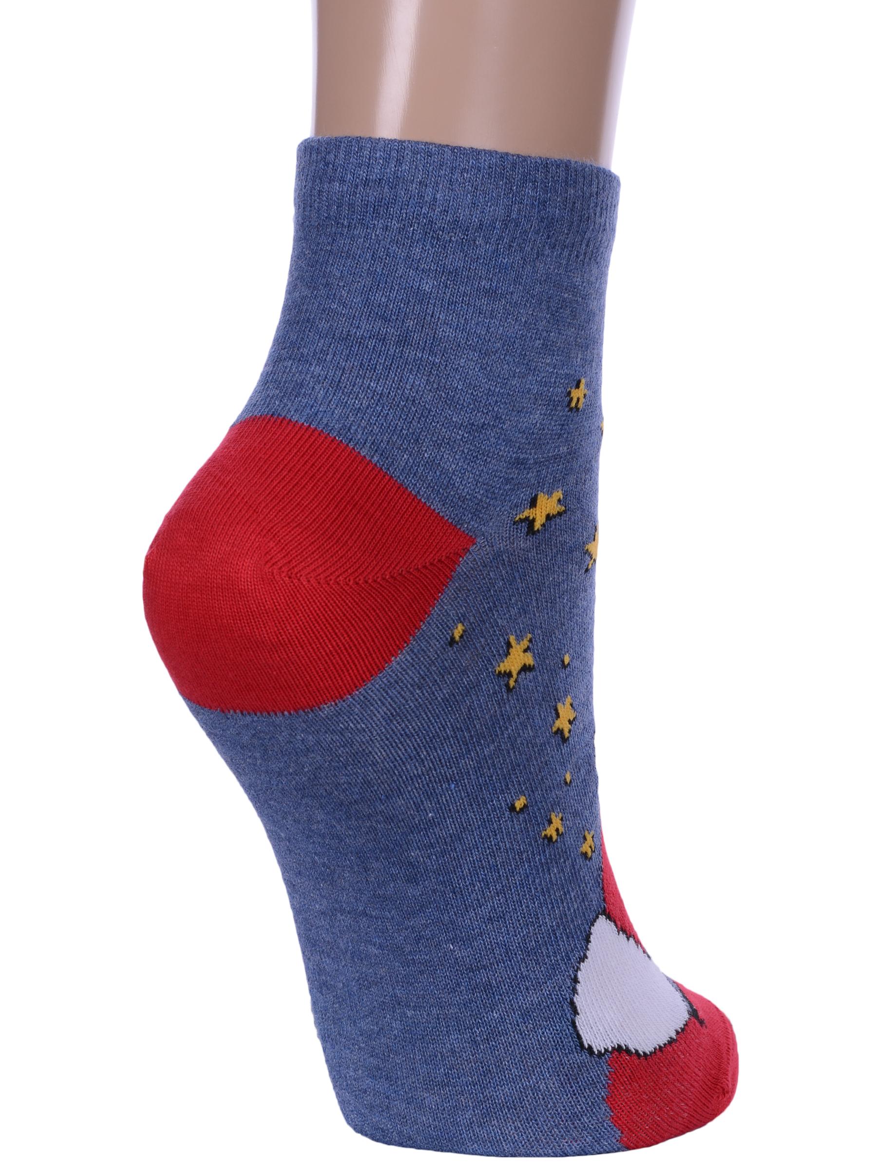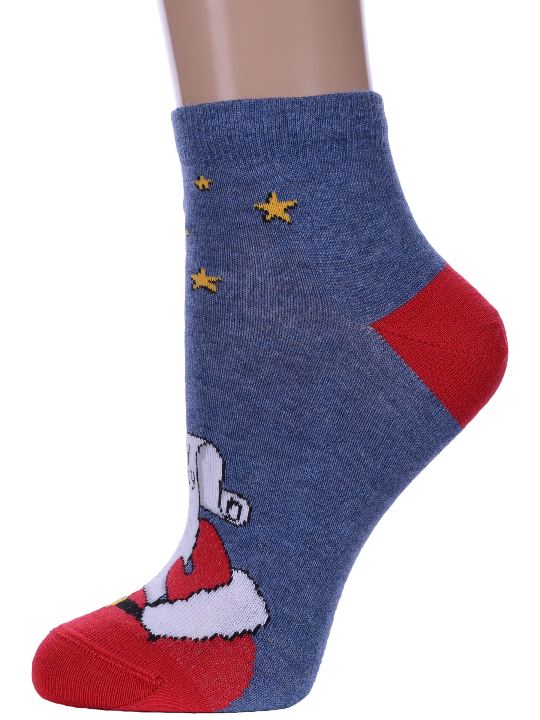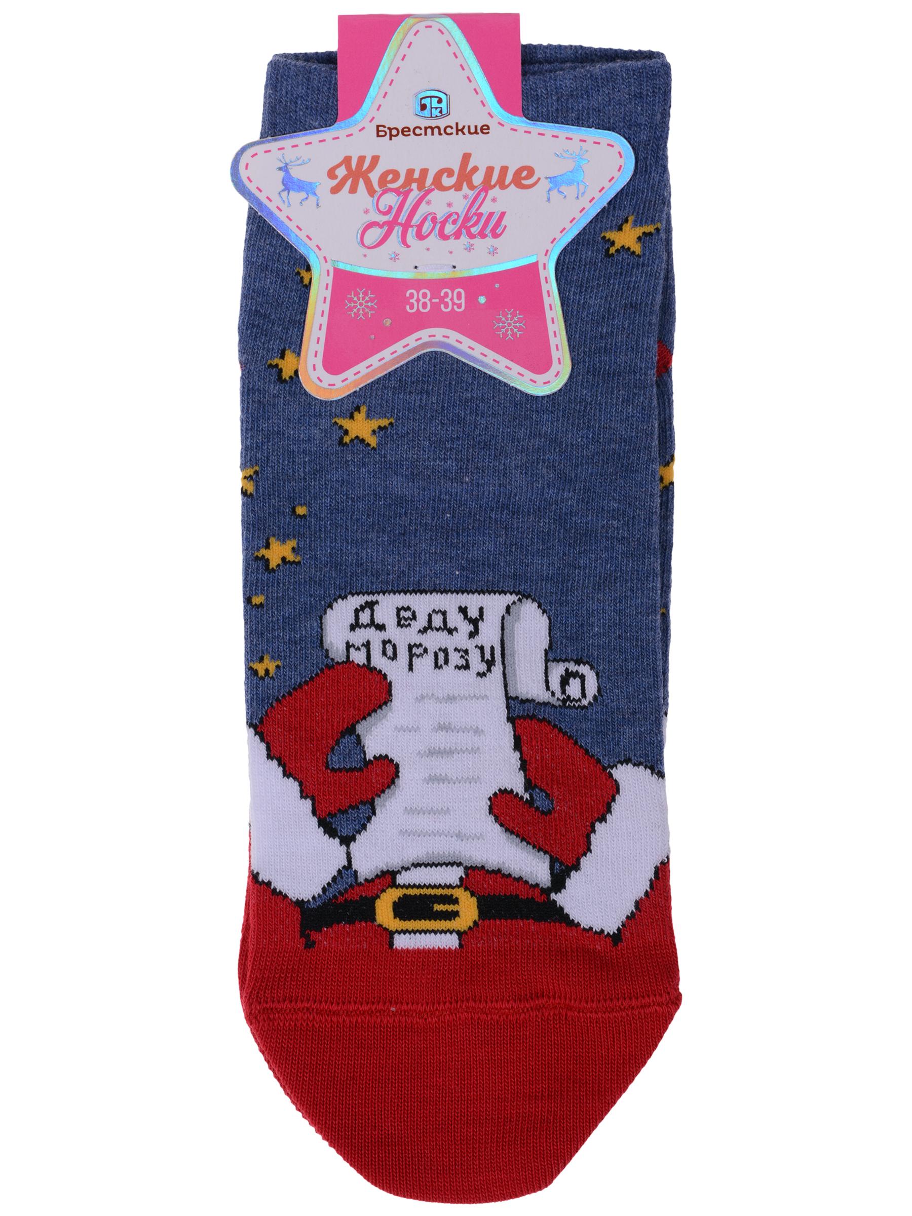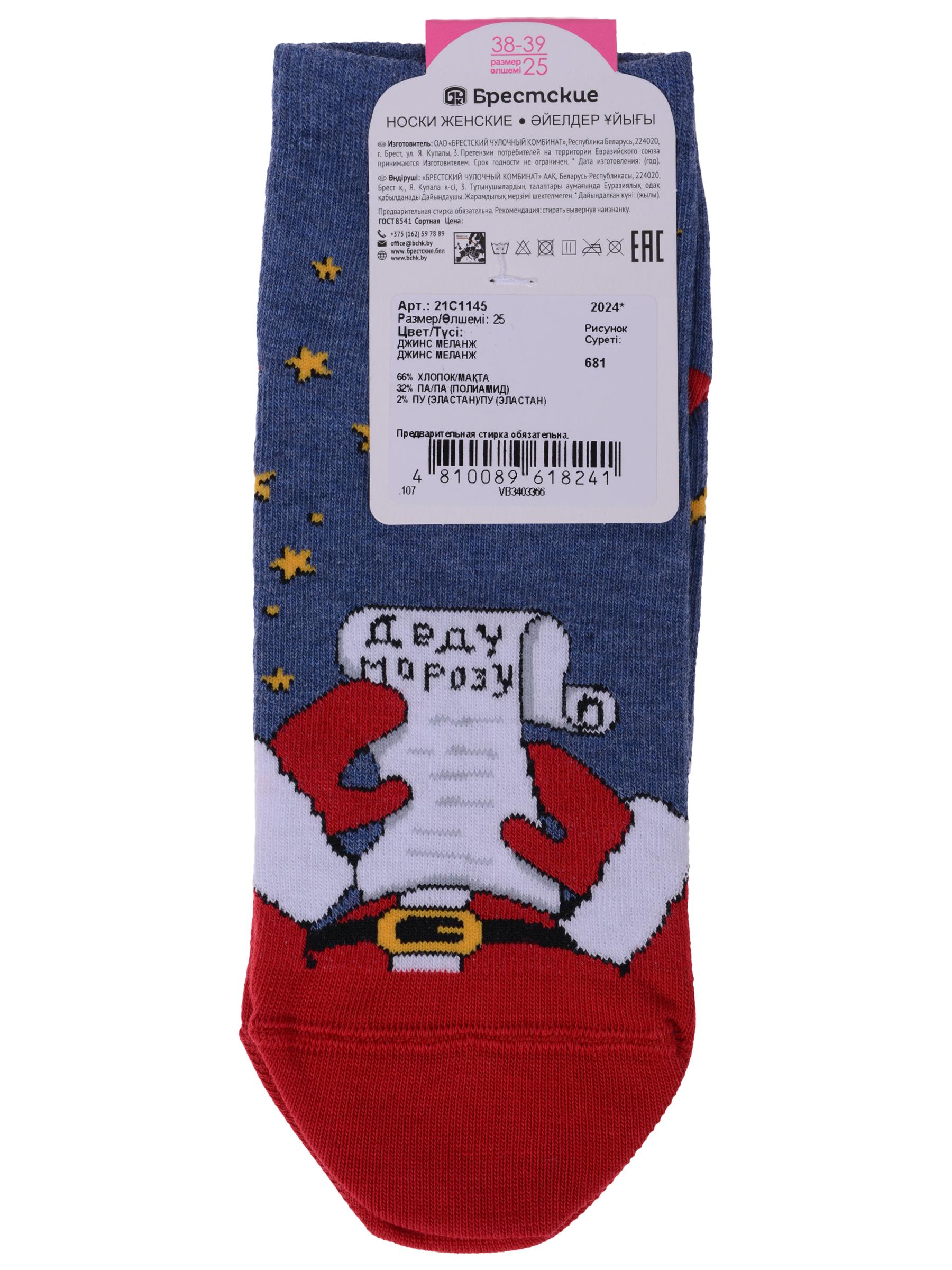 Круглогодичные укороченные женские носки, цвет джинс, шов плоский, принт (рисунок): новый год, состав: 66% хлопок, 32% полиамид, 2% эластан, арт. 21С1145. Производитель «Брестский чулочный комбинат ОАО, Беларусь» под брендом «Брестские (бчк)».