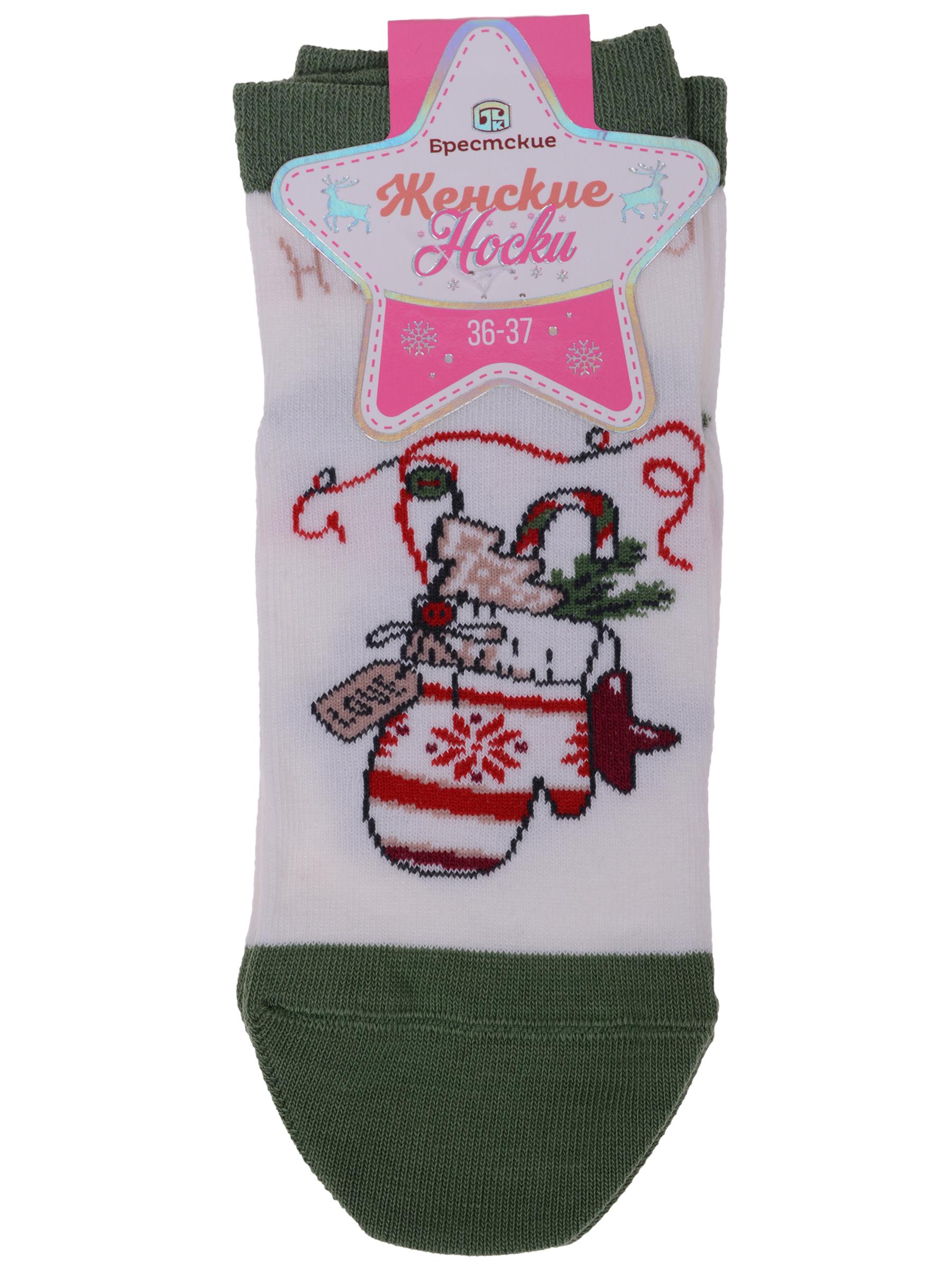 Круглогодичные укороченные женские носки, цвет бежевый, шов плоский, принт (рисунок): новый год, состав: 66% хлопок, 32% полиамид, 2% эластан, арт. 21С1145. Производитель «Брестский чулочный комбинат ОАО, Беларусь» под брендом «Брестские (бчк)».