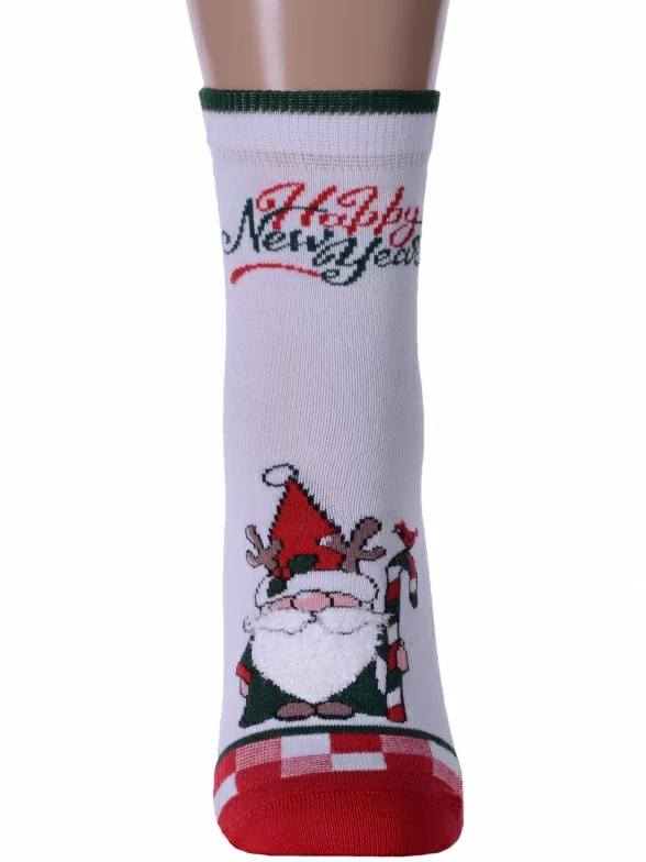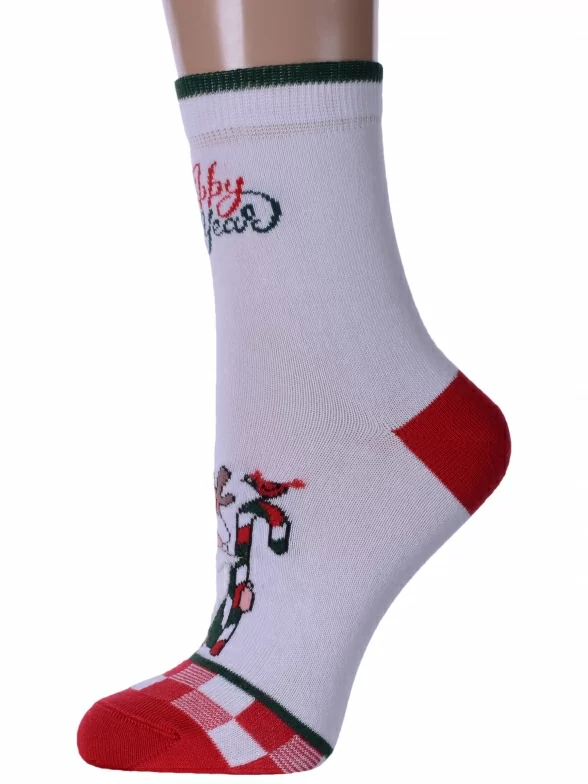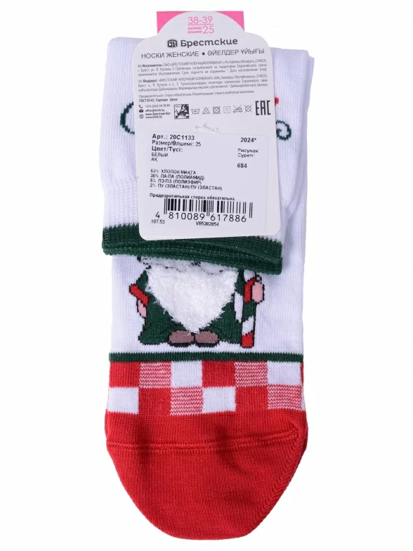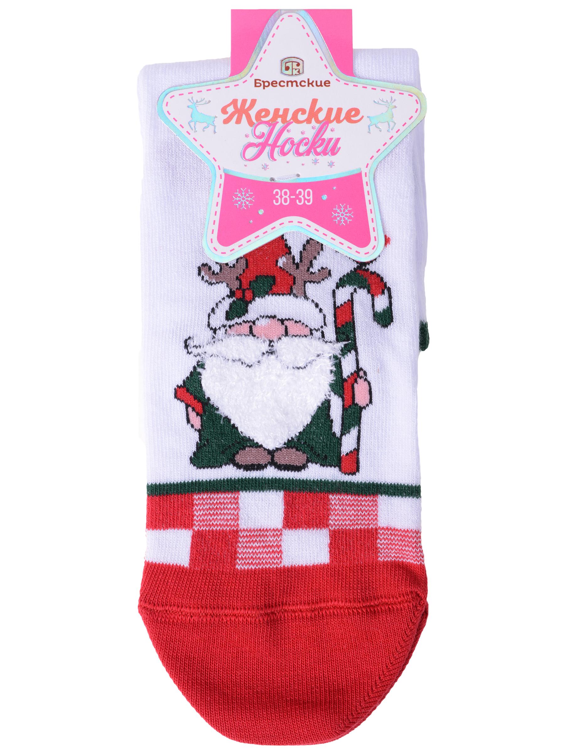 Круглогодичные укороченные женские носки, цвет белый, шов плоский, принт (рисунок): новый год, состав: 63% хлопок, 30% полиамид, 5% полиэстер, 2% эластан, арт. 20С1133. Производитель «Брестский чулочный комбинат ОАО, Беларусь» под брендом «Брестские (бчк)».