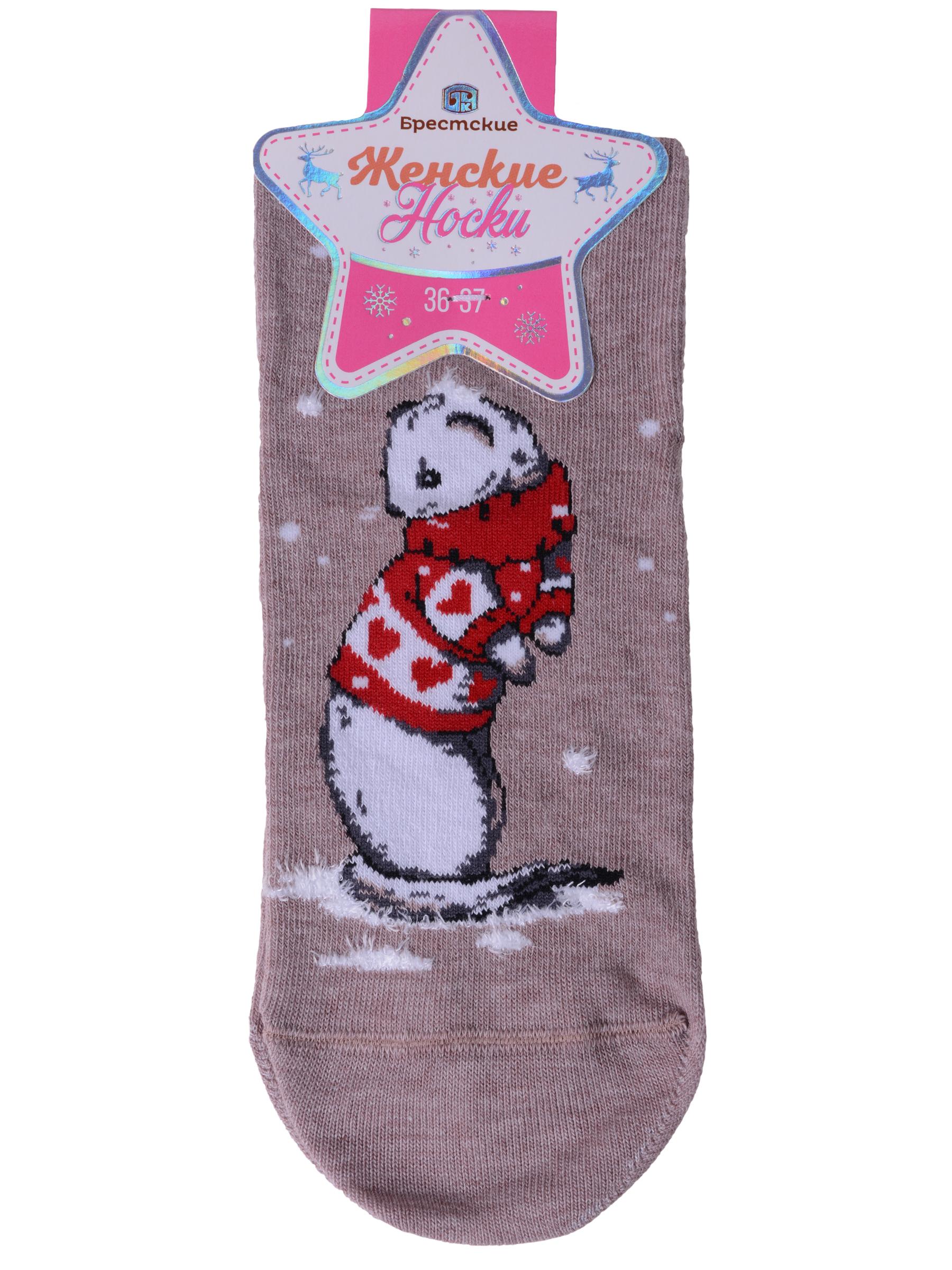Круглогодичные укороченные женские носки, цвет бежевый, шов плоский, принт (рисунок): новый год, состав: 63% хлопок, 30% полиамид, 5% полиэстер, 2% эластан, арт. 20С1133. Производитель «Брестский чулочный комбинат ОАО, Беларусь» под брендом «Брестские (бчк)».